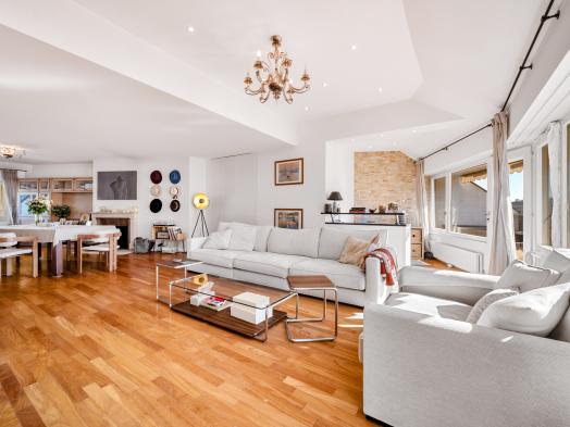Discover this superb duplex penthouse ideally located in the heart of Geneva, in the sought-after Champel district. Occupying the 6th and top floors of a building erected in 1985, this 7.5-room through-apartment, completely renovated in 2012, offers around 230 sqm of living space and two pleasant terraces. Perfectly laid out, this bright apartment is particularly appealing thanks to its south-east exposure. High-quality finishes and a fireplace give the apartment a warm, elegant atmosphere. Its privileged location, in the immediate vicinity of the city center, all amenities, renowned schools as well as sports and cultural facilities, makes it a particularly sought-after property. The living space is organized around an entrance hall leading to a vast living room with dining area, a separate kitchen and a first en suite bedroom. The sleeping area comprises two further en suite bedrooms, each with its own shower room. Two basement