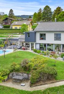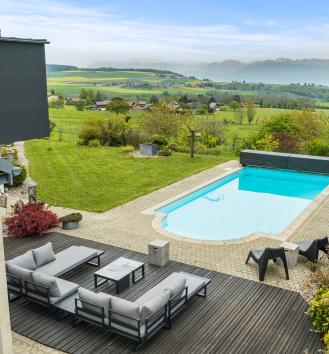 This superb contemporary-style family home was built in 2001 and offers unobstructed views of the surrounding countryside, the lake and the Alps. Located on the edge of the village, it offers quick access to the shops and benefits from a quiet, bucolic setting. The 330sqm house has been built on a plot of over 1400sqm, so you can enjoy the garden and terrace all year round. Very pleasant to live in, with fluid circulation, each of the two levels offers beautiful spaces. On the ground floor, there are several lounges, a billiard room and a lovely study. The kitchen opens onto a beautiful dining room and the pergola, which houses a summer dining room opening onto a large terrace and the swimming pool. The first floor features a large master suite, three children's bedrooms, a bow window with an office space and a laundry room.