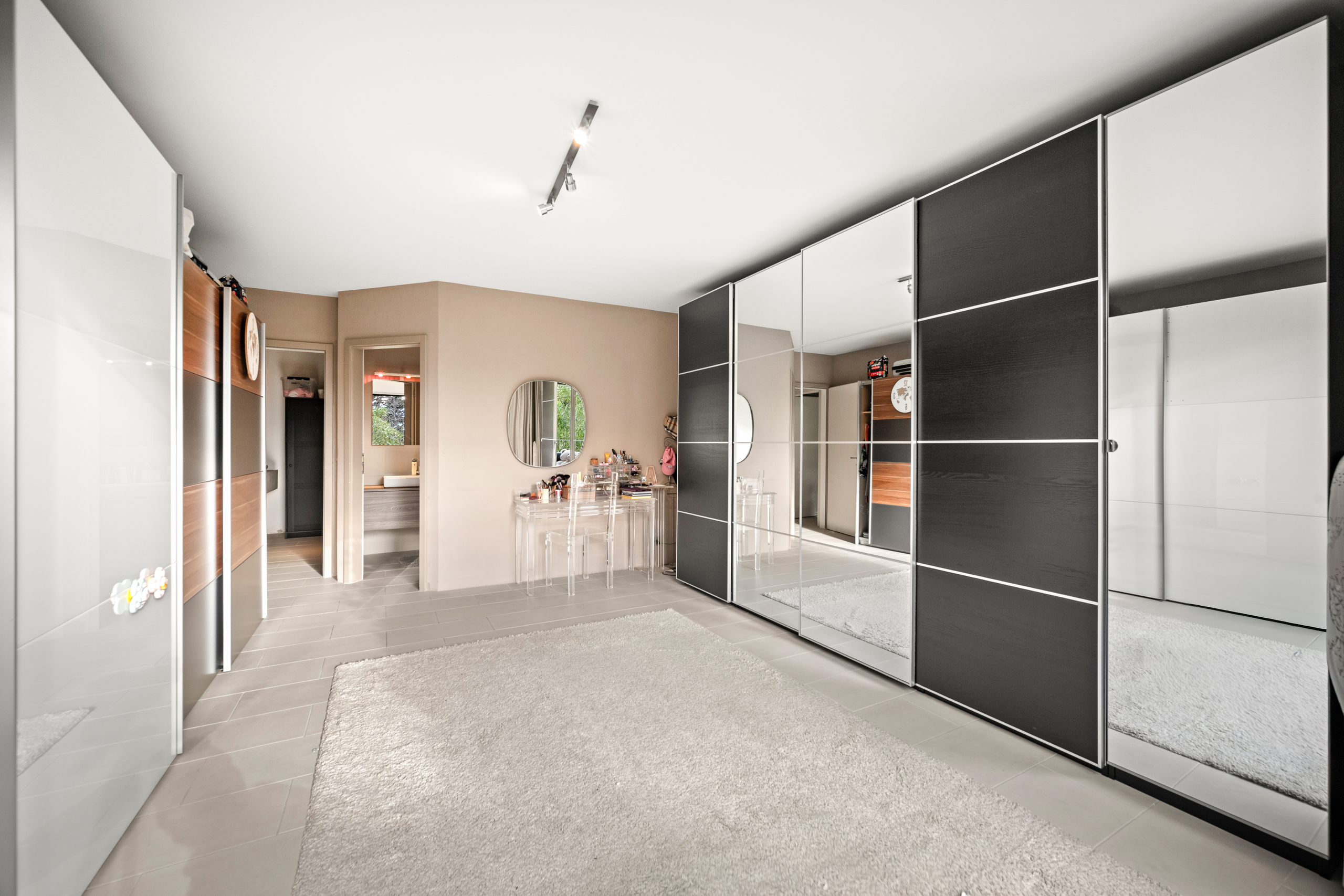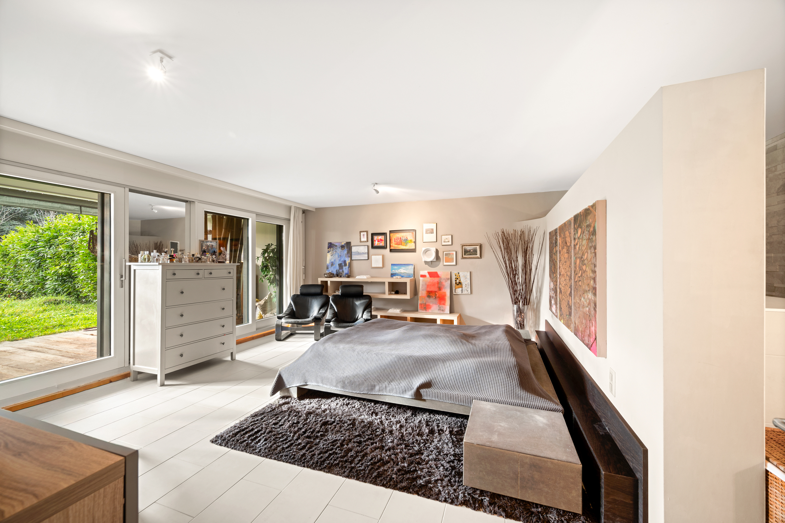 The sleeping area is located on the garden level and comprises two bedrooms, each with its own en-suite bathroom. The particularly generous master suite has its own private terrace.
