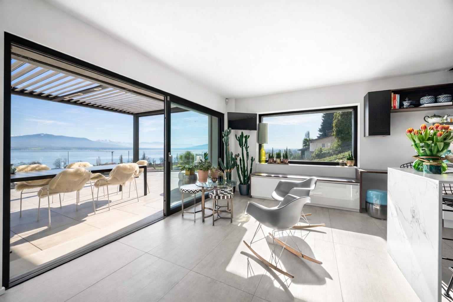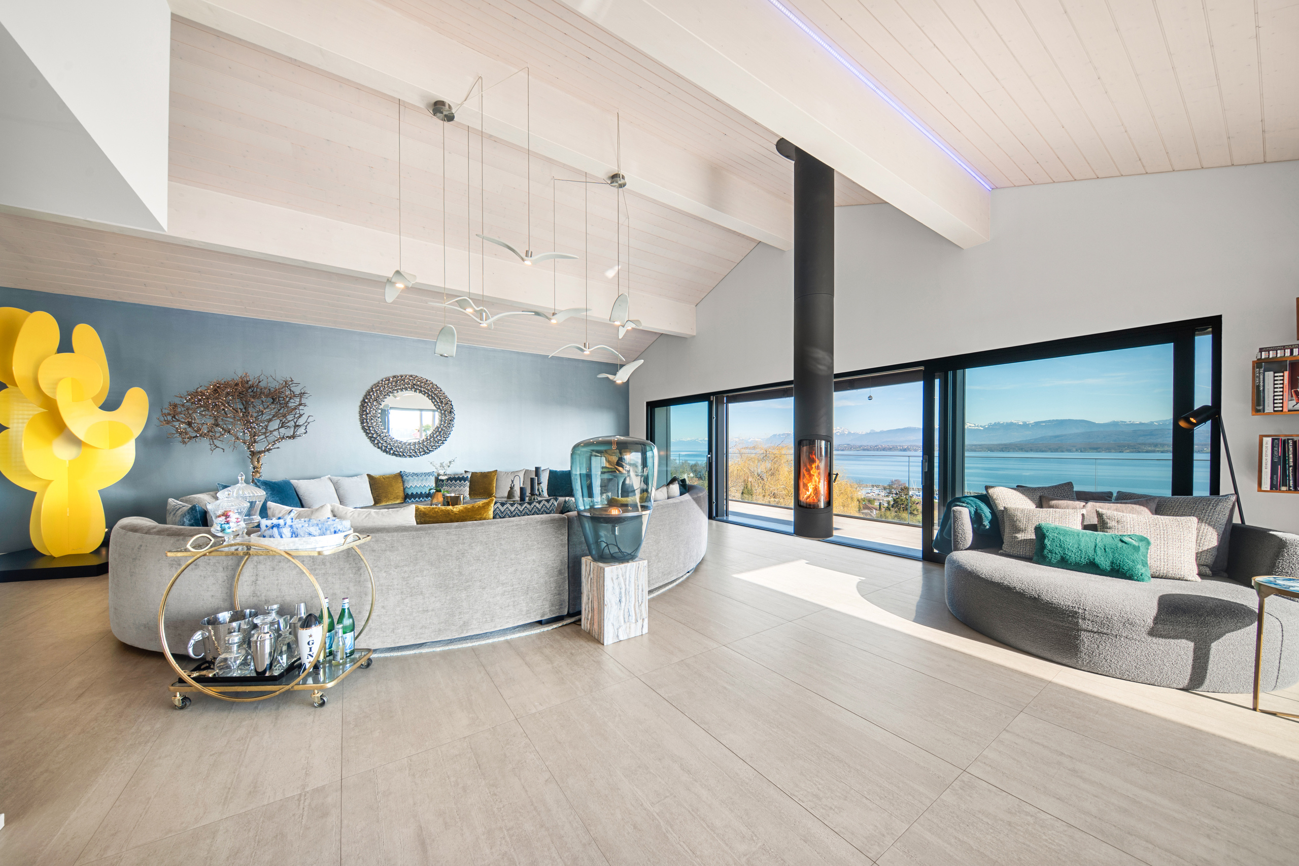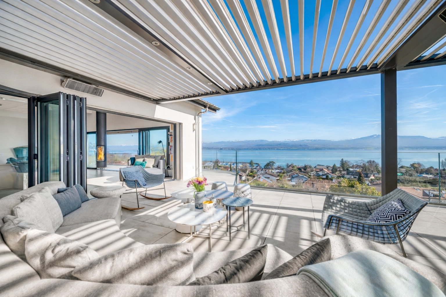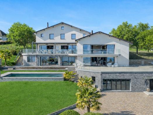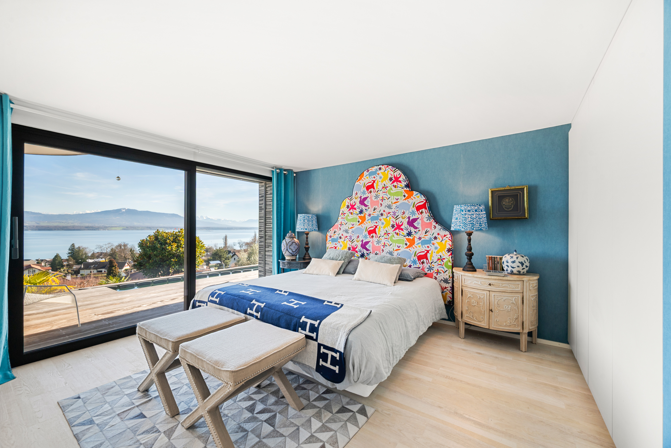 Nestled in a prime residential setting in Crans, at the heart of the highly sought-after Terre Sainte region, this elegant contemporary property enjoys an exceptional location just 20 minutes from Geneva. It offers panoramic views over Lake Geneva, the port of Crans and Mont Blanc. The setting is ideal, within immediate proximity to the lakeshore and some of the most prestigious international schools. Fully renovated with great care, the house stands out for its modern architecture and clean lines. Every element has been selected to the highest standards: premium materials, bespoke fittings, top-quality equipment and refined finishes throughout. The generous volumes and expansive reception areas bathed in natural light create a bright and welcoming atmosphere, enhancing everyday comfort and quality of life. The living areas open onto large terraces overlooking the lake, and every room in the house enjoys the view. Offering approximately 700 sqm of living