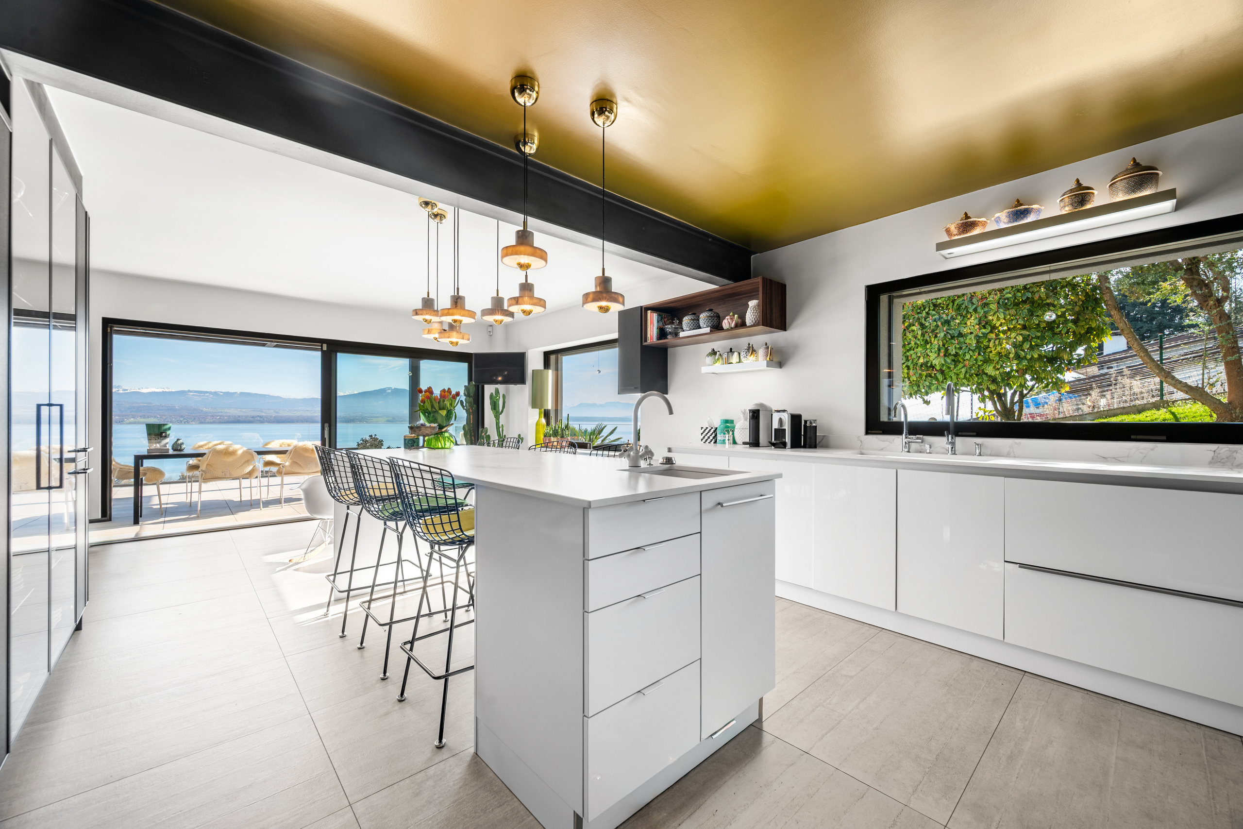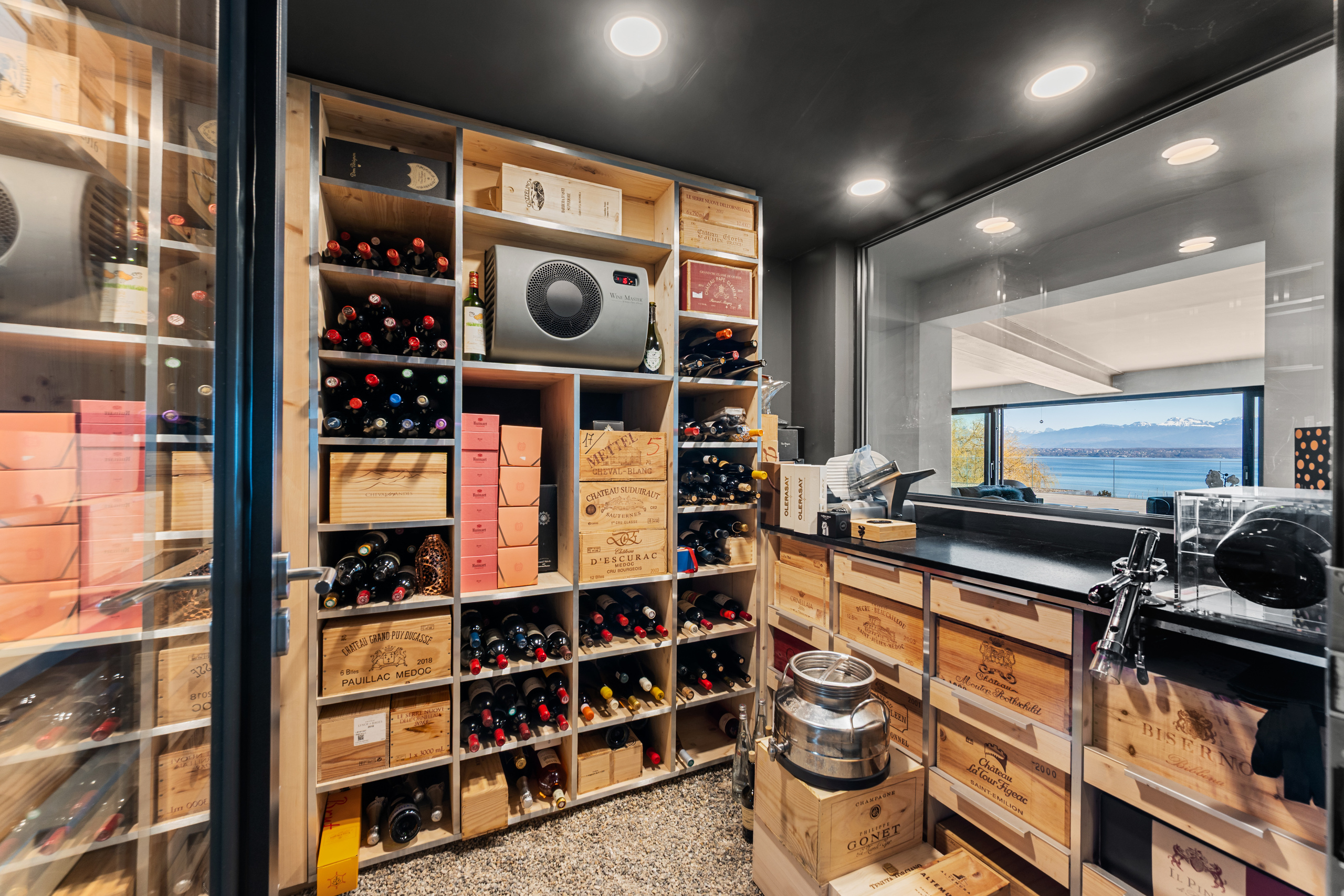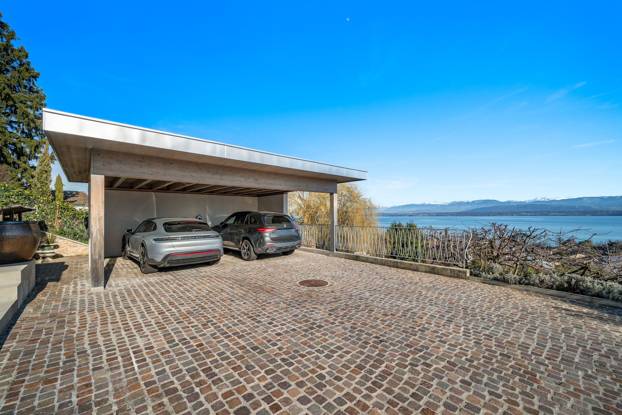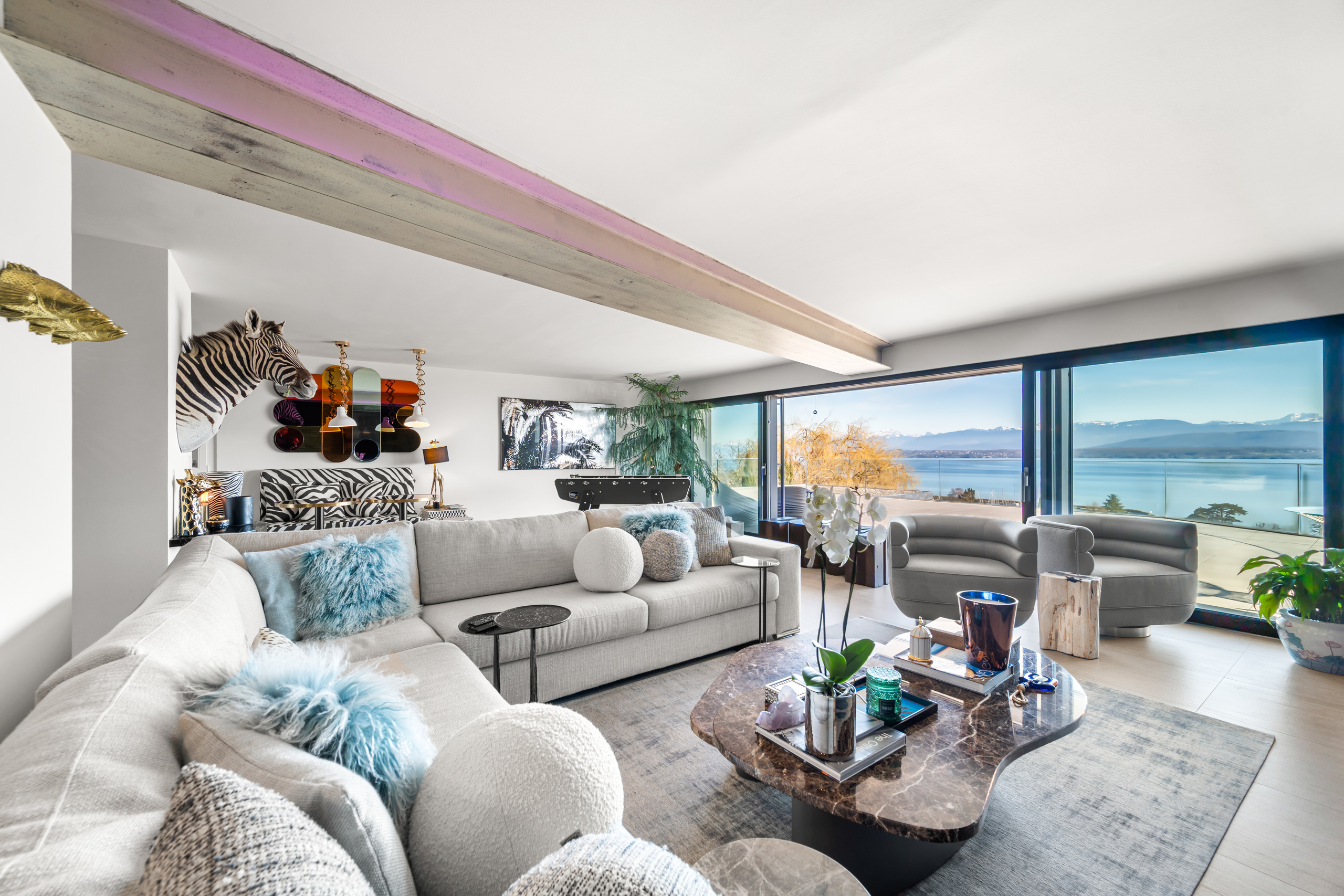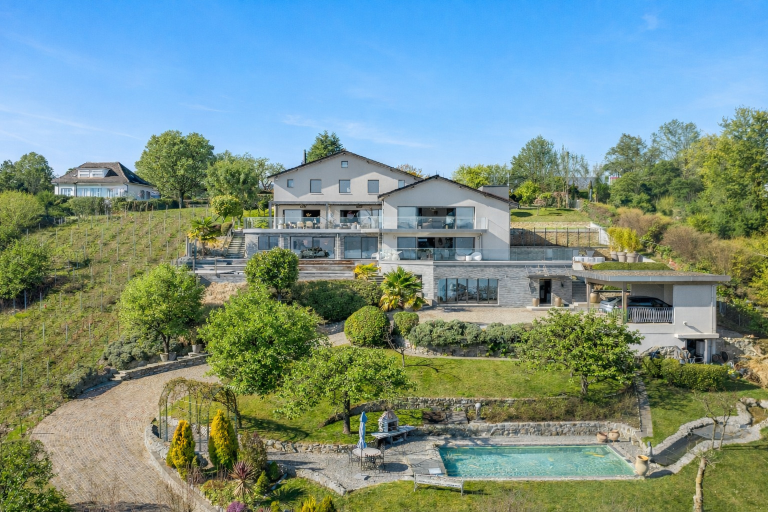 Nestled in a prime residential setting in Crans, at the heart of the highly sought-after Terre Sainte region, this elegant contemporary property enjoys an exceptional location just 20 minutes from Geneva. It offers panoramic views over Lake Geneva, the port of Crans and Mont Blanc. The setting is ideal, within immediate proximity to the lakeshore and some of the most prestigious international schools. Fully renovated with great care, the house stands out for its modern architecture and clean lines. Every element has been selected to the highest standards: premium materials, bespoke fittings, top-quality equipment and refined finishes throughout. The generous volumes and expansive reception areas bathed in natural light create a bright and welcoming atmosphere, enhancing everyday comfort and quality of life. The living areas open onto large terraces overlooking the lake, and every room in the house enjoys the view. Offering approximately 700 sqm of living