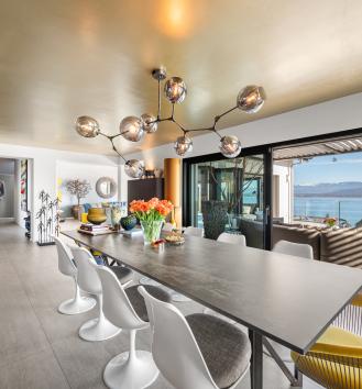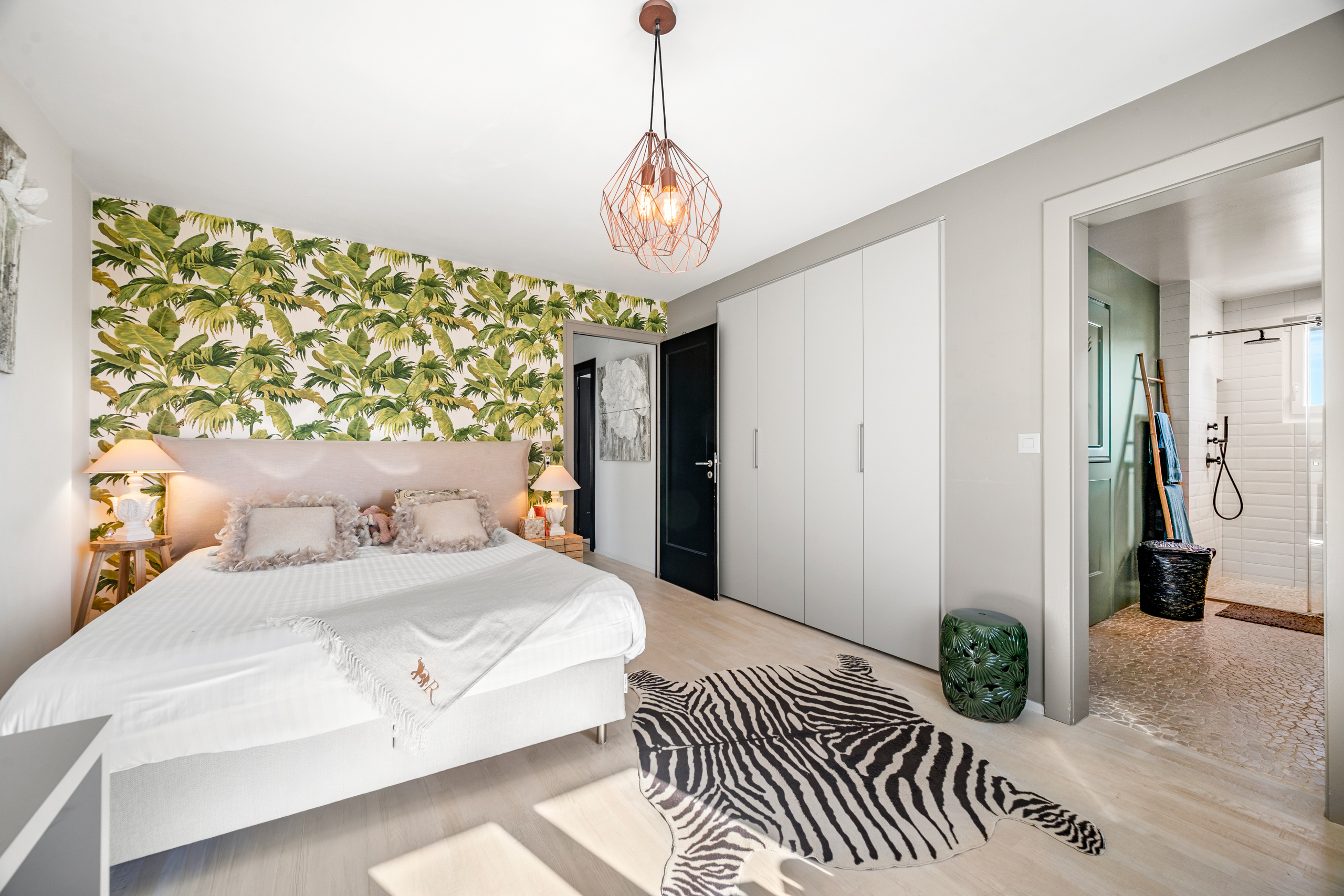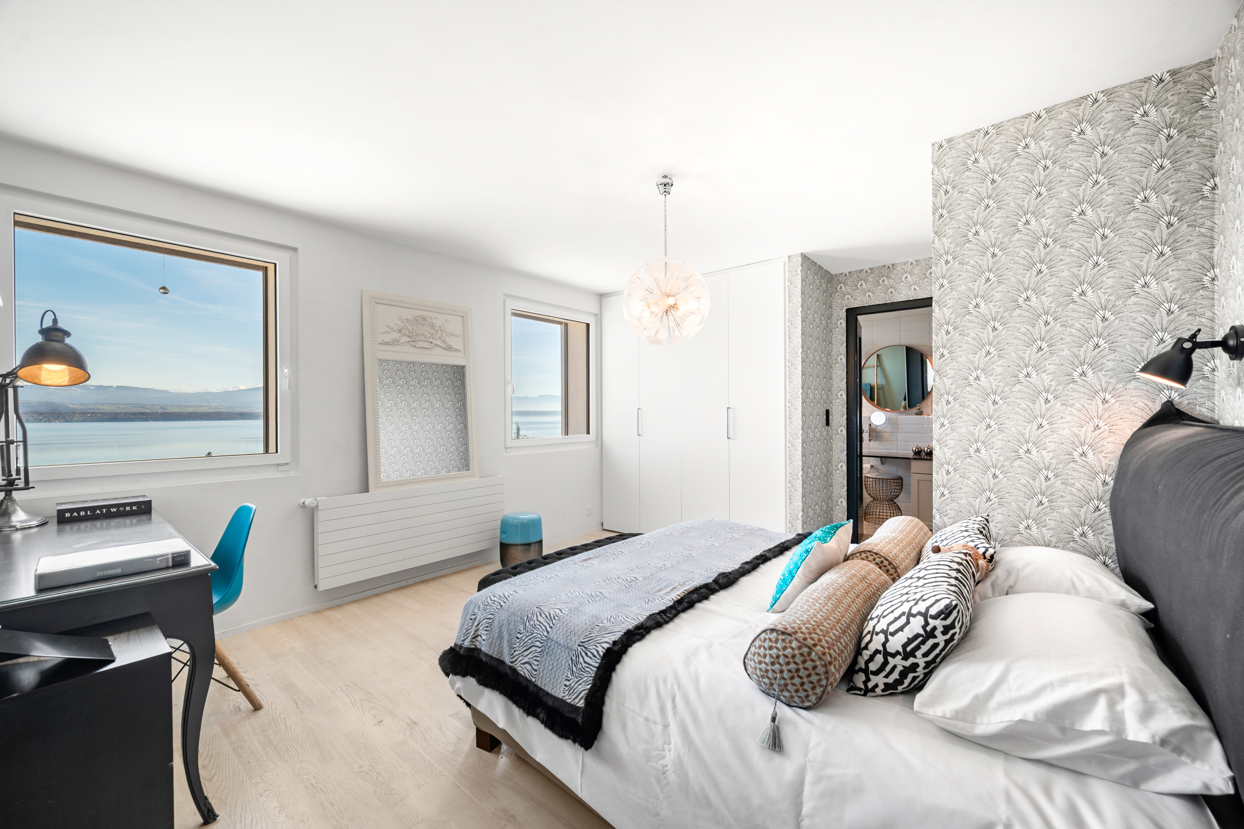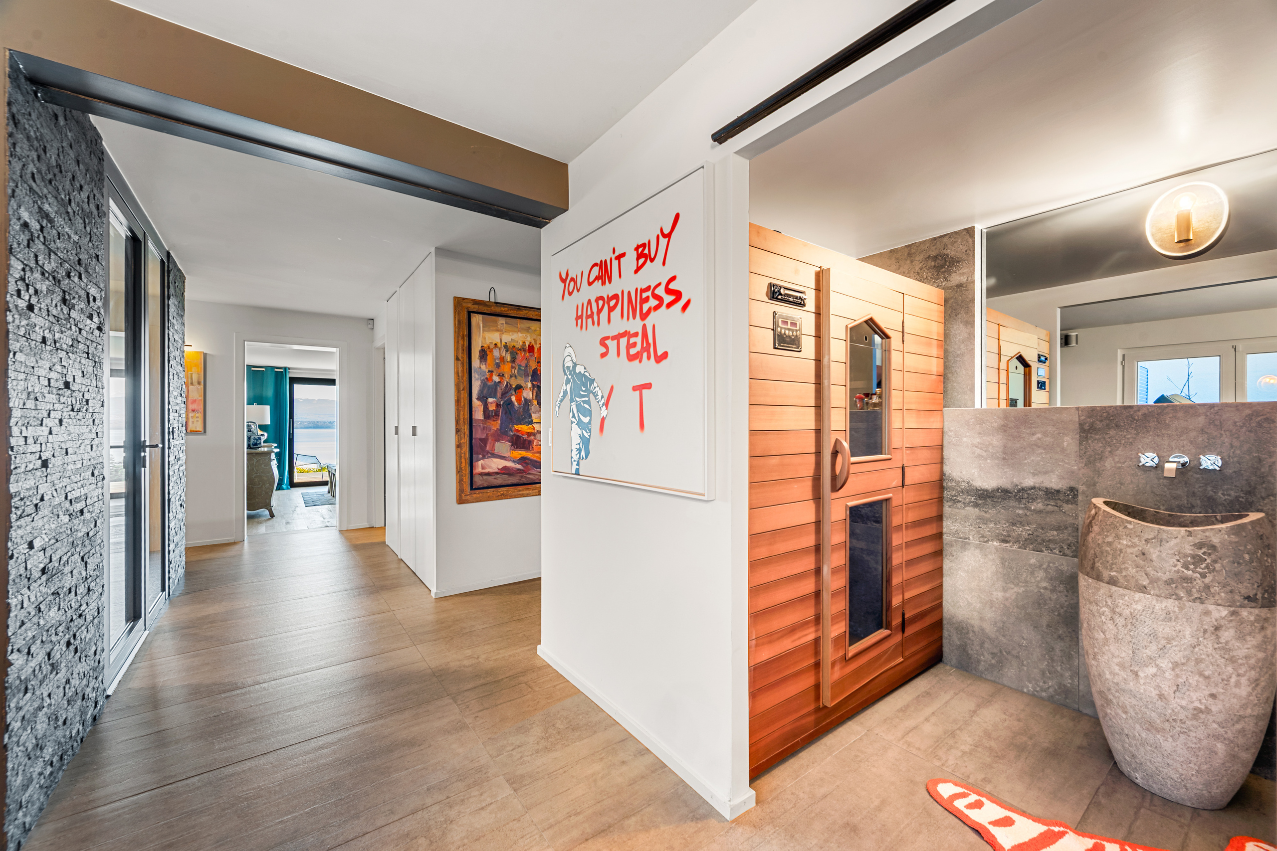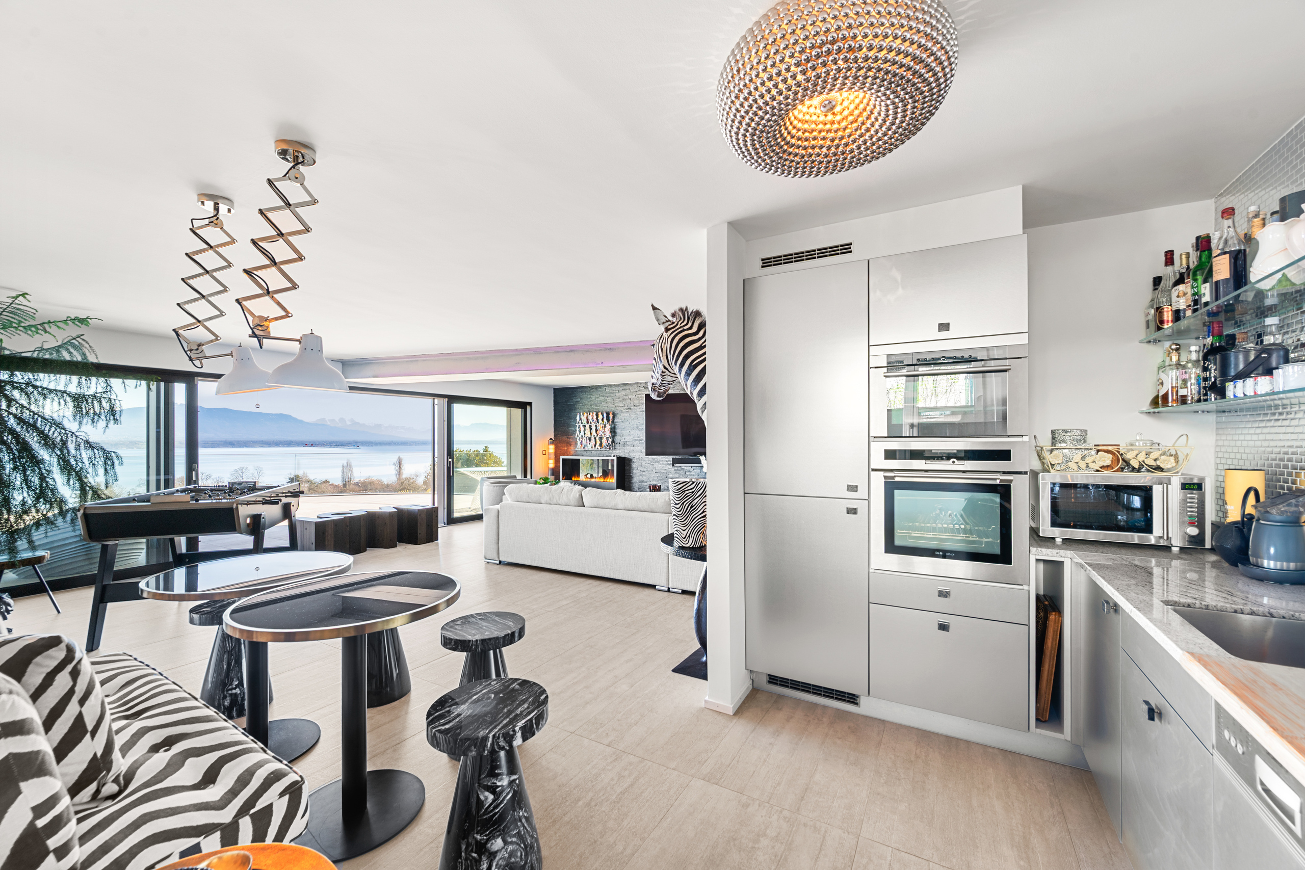 Nestled in a prime residential setting in Crans, at the heart of the highly sought-after Terre Sainte region, this elegant contemporary property enjoys an exceptional location just 20 minutes from Geneva. It offers panoramic views over Lake Geneva, the port of Crans and Mont Blanc. The setting is ideal, within immediate proximity to the lakeshore and some of the most prestigious international schools. Fully renovated with great care, the house stands out for its modern architecture and clean lines. Every element has been selected to the highest standards: premium materials, bespoke fittings, top-quality equipment and refined finishes throughout. The generous volumes and expansive reception areas bathed in natural light create a bright and welcoming atmosphere, enhancing everyday comfort and quality of life. The living areas open onto large terraces overlooking the lake, and every room in the house enjoys the view. Offering approximately 700 sqm of living