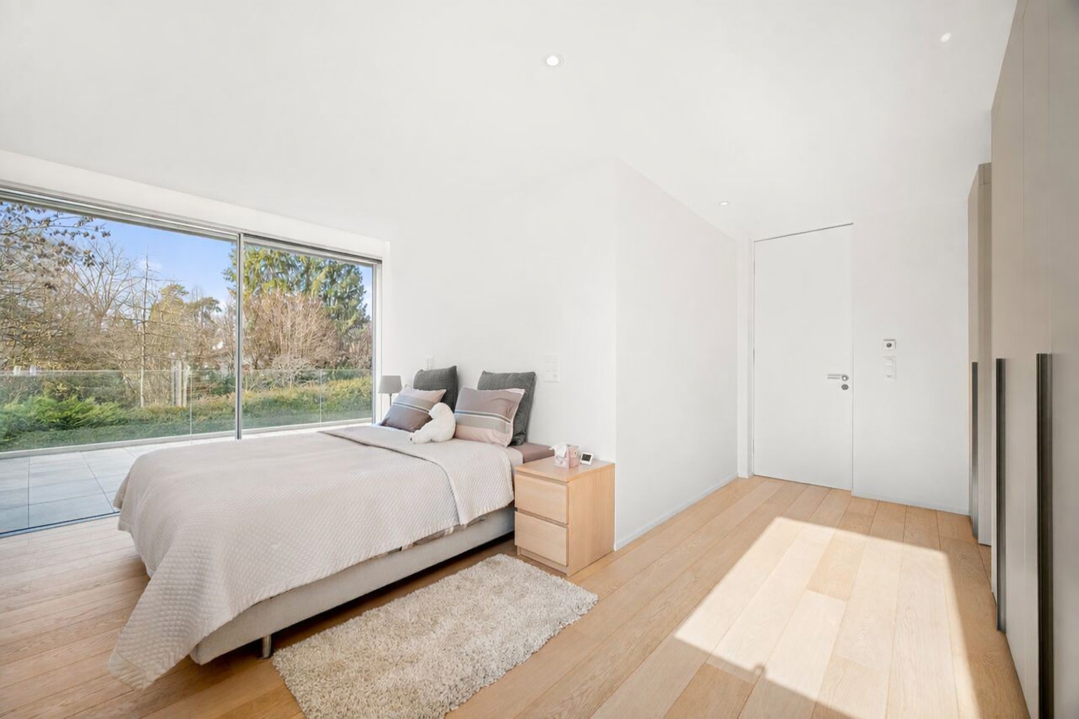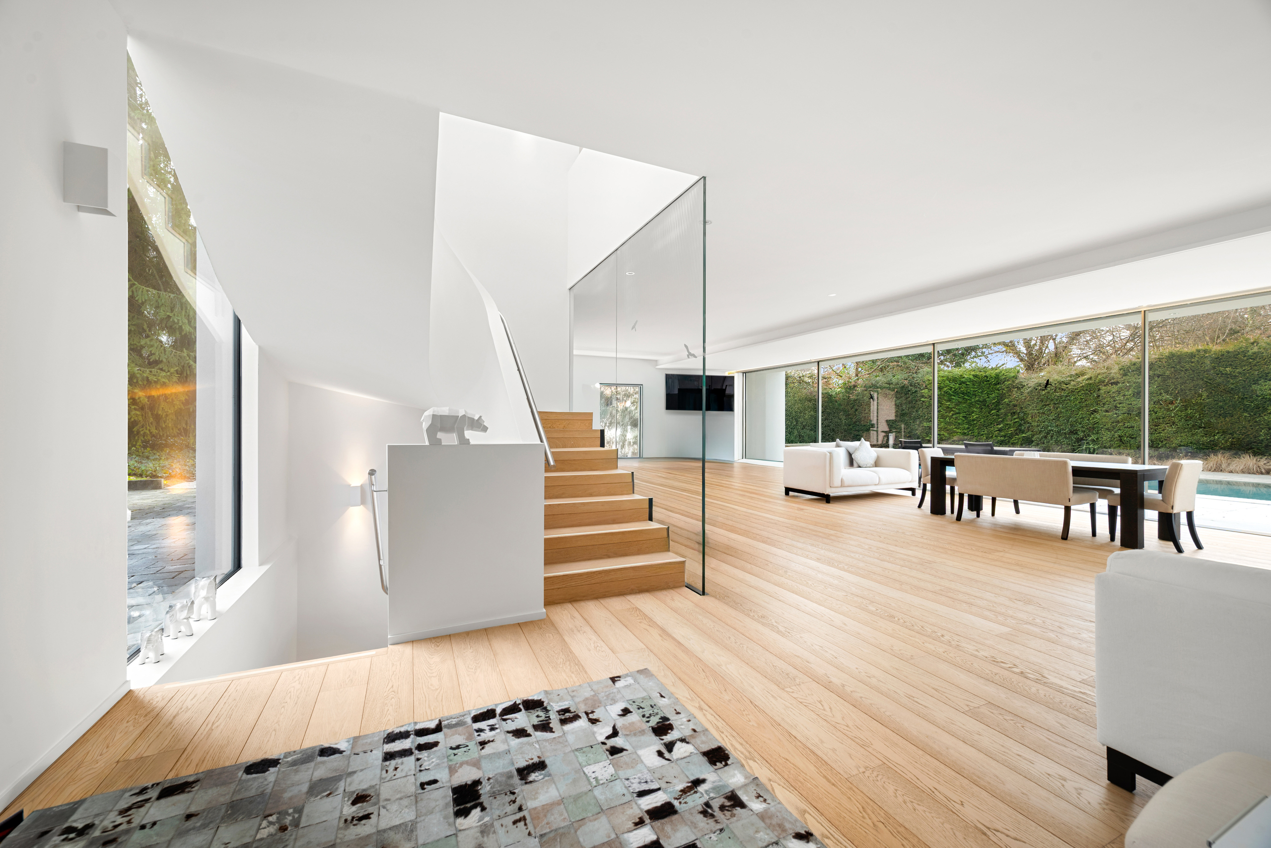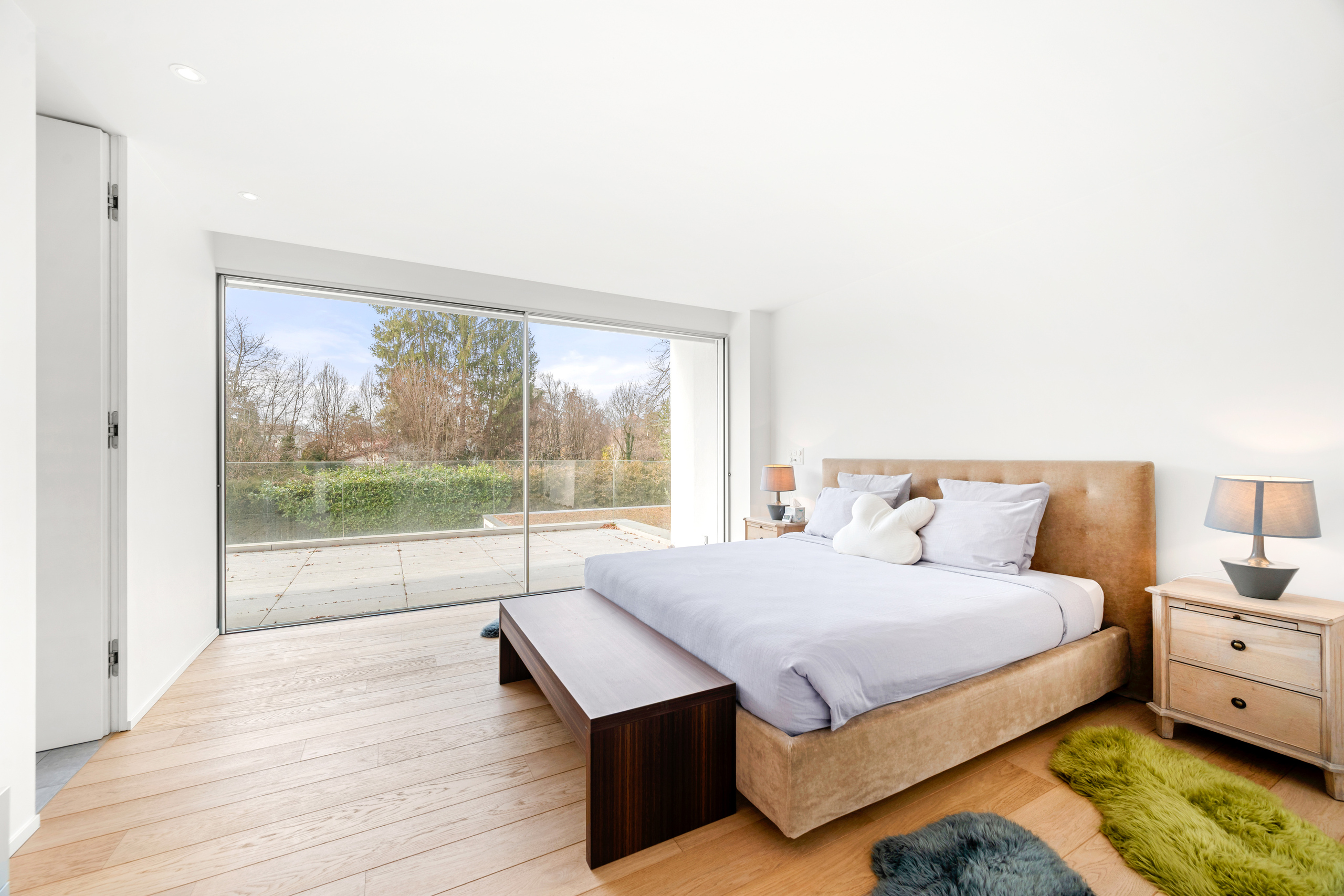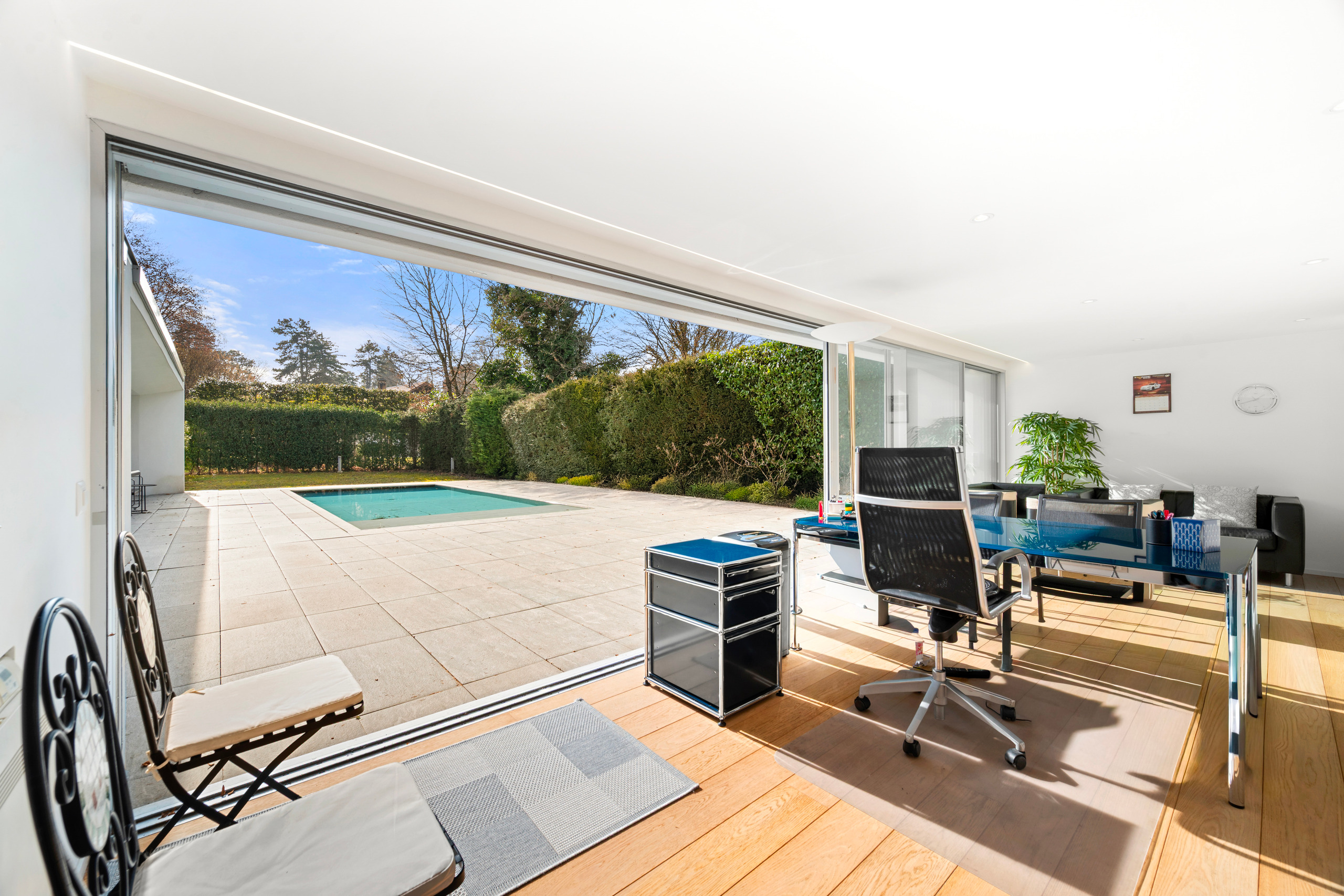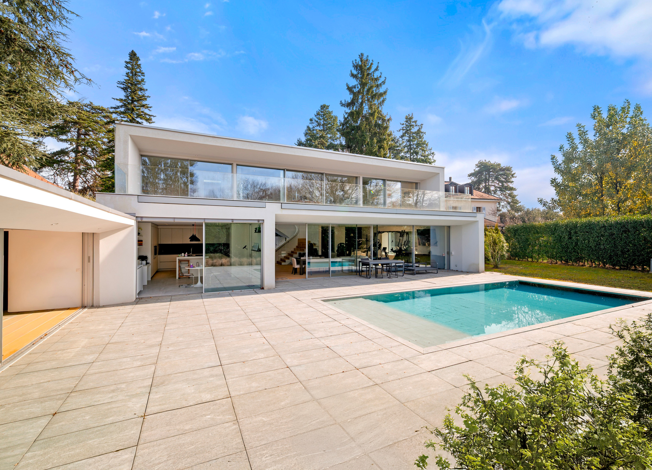 Nestled in the heart of the highly sought-after residential area of Chêne-Bougeries, this stunning contemporary villa is set at the end of a secluded path, offering absolute privacy, serenity, and modern elegance. Set on a landscaped plot of 1,250 sqm, the property spans over 550 sqm of usable space, impressing with its generous volumes, abundant natural light, and large floor-to-ceiling windows opening onto the outdoors. Ideally located near the prestigious Moser School and the International School of La Grande Boissière, close to public transport, and just a few minutes from Geneva city center, this exceptional villa offers all the qualities of a truly rare property. Designed for family living, the villa features a harmonious layout and high-quality finishes. The ground floor opens onto a spacious entrance hall with built-in storage, a guest WC, followed by a reception area of approximately 115 sqm, including a large living room and a dining room with a fireplace The fully fitted kitchen also provides direct access to the