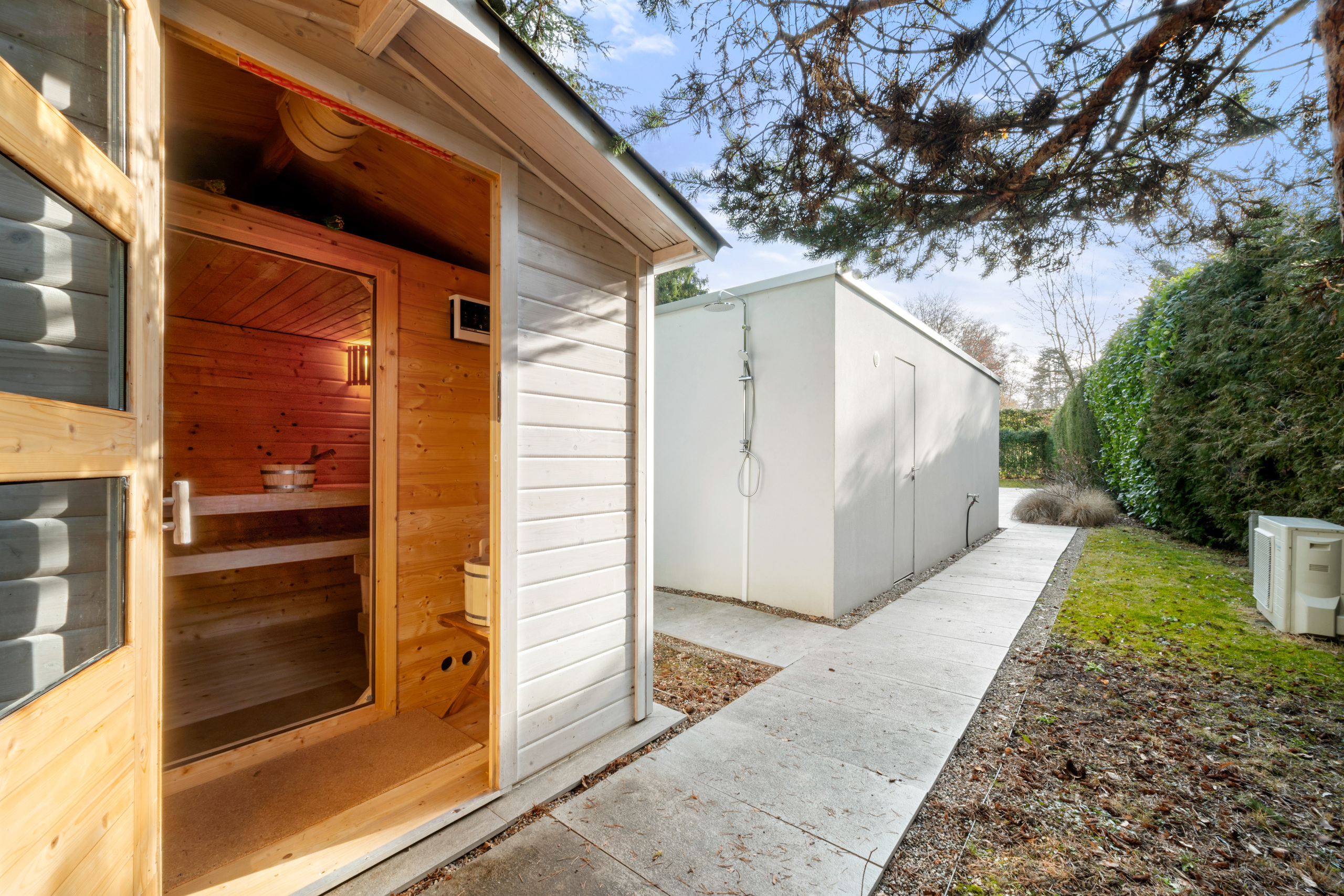 A large terrace extends into a meticulously landscaped garden, featuring a heated outdoor pool and a sauna. A paved courtyard accommodating several vehicles, along with a double garage, completes this exceptional property.