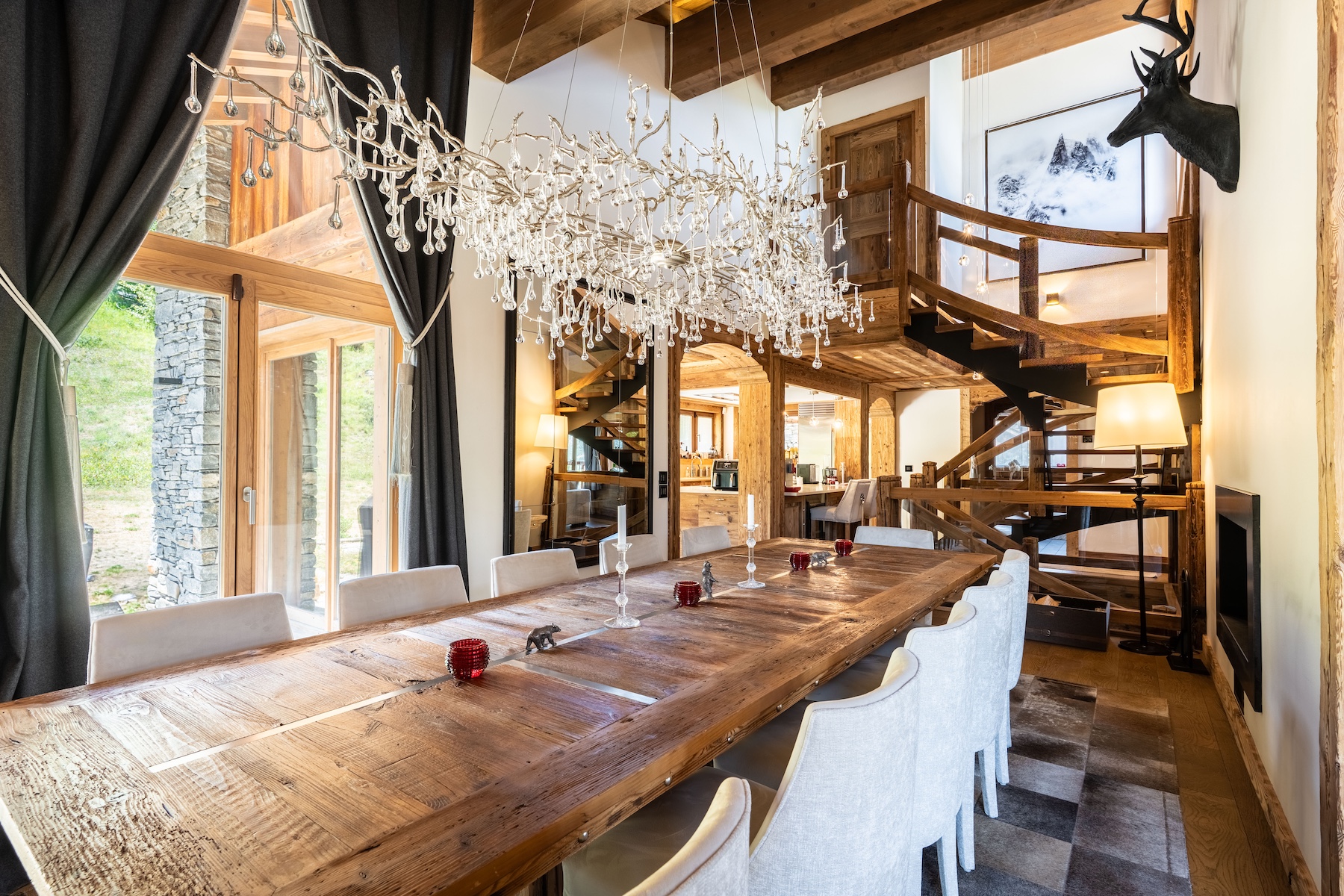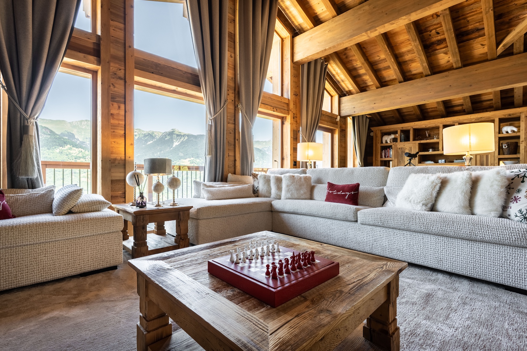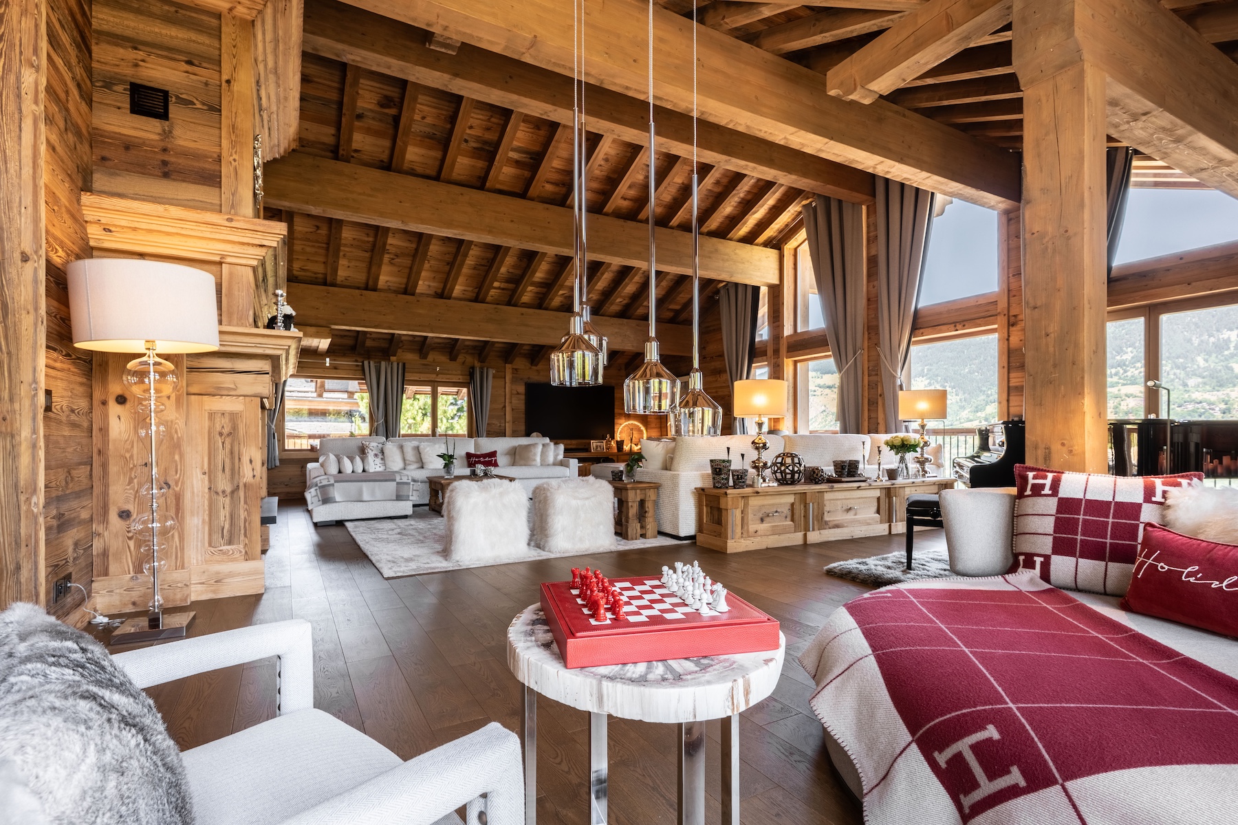 This chalet, with a total surface area of 640 sq m spread over five levels, features a 155 sq m living space with a terrace, balconies, and an exceptional panoramic view of the surrounding valleys and peaks.