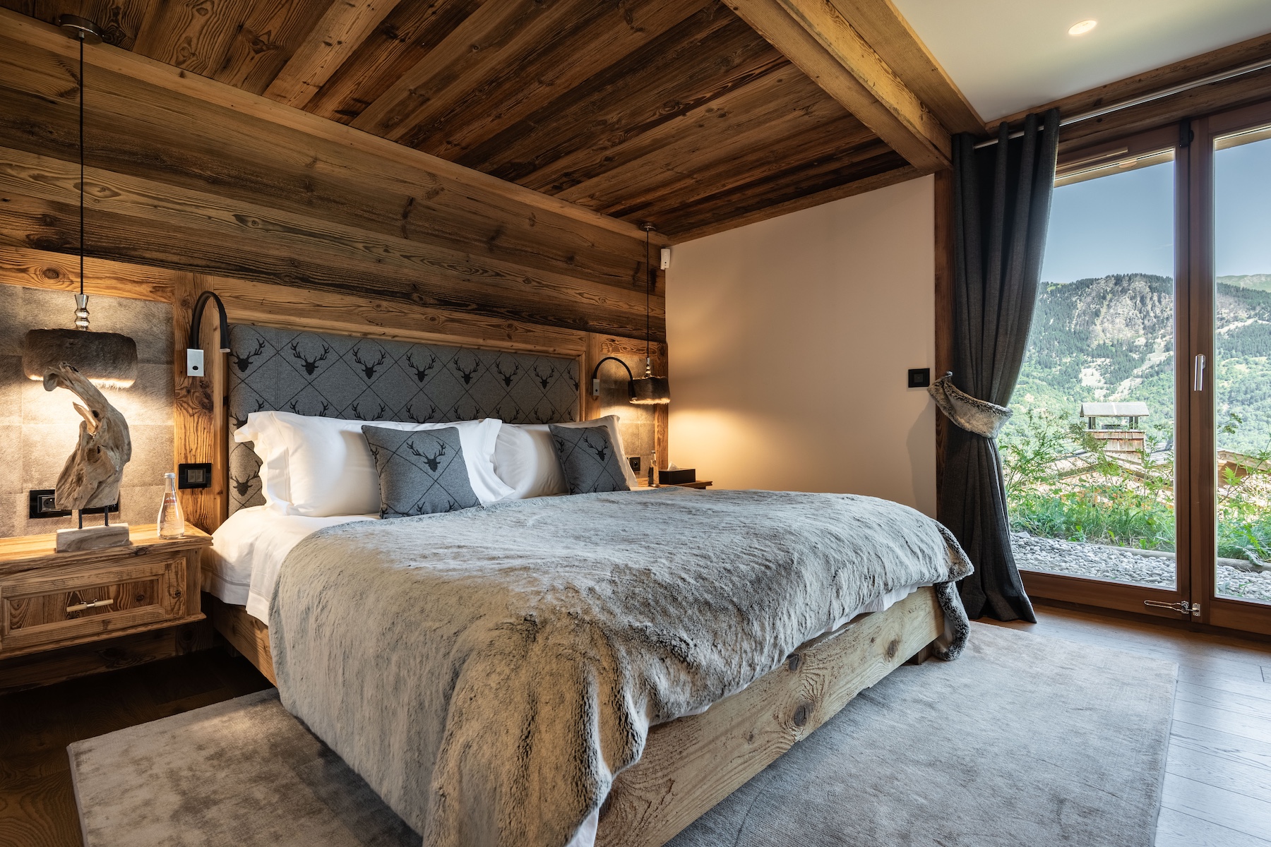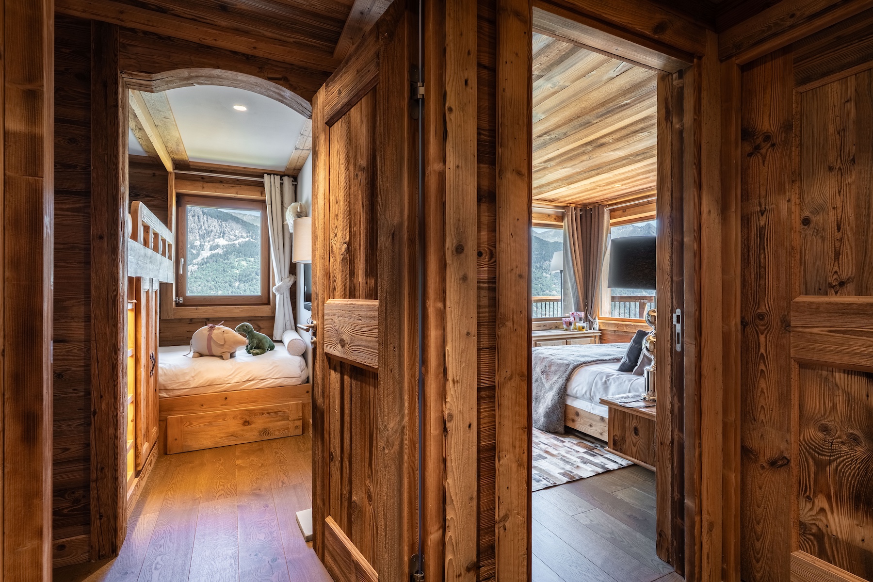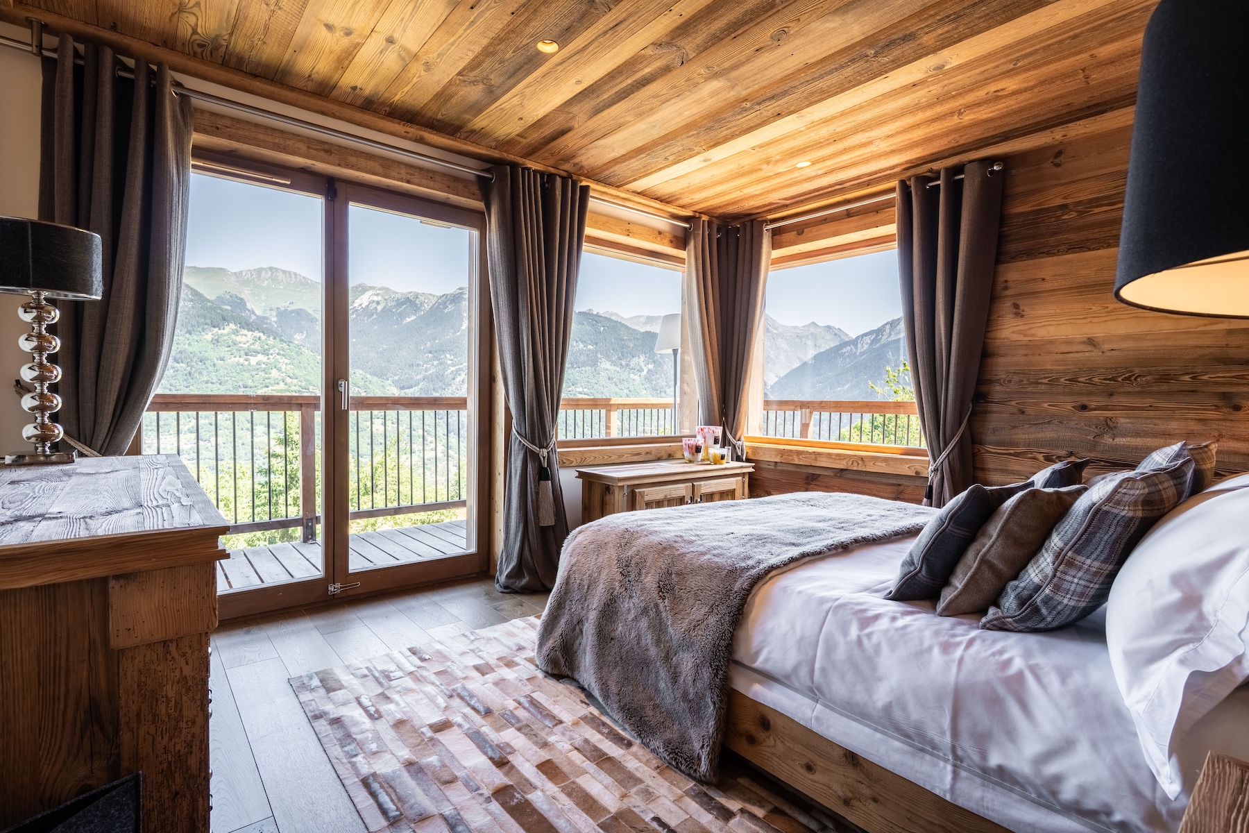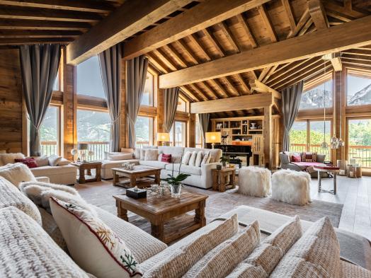 This chalet, with a total surface area of 640 sq m spread over five levels, features a 155 sq m living space with a terrace, balconies, and an exceptional panoramic view of the surrounding valleys and peaks.