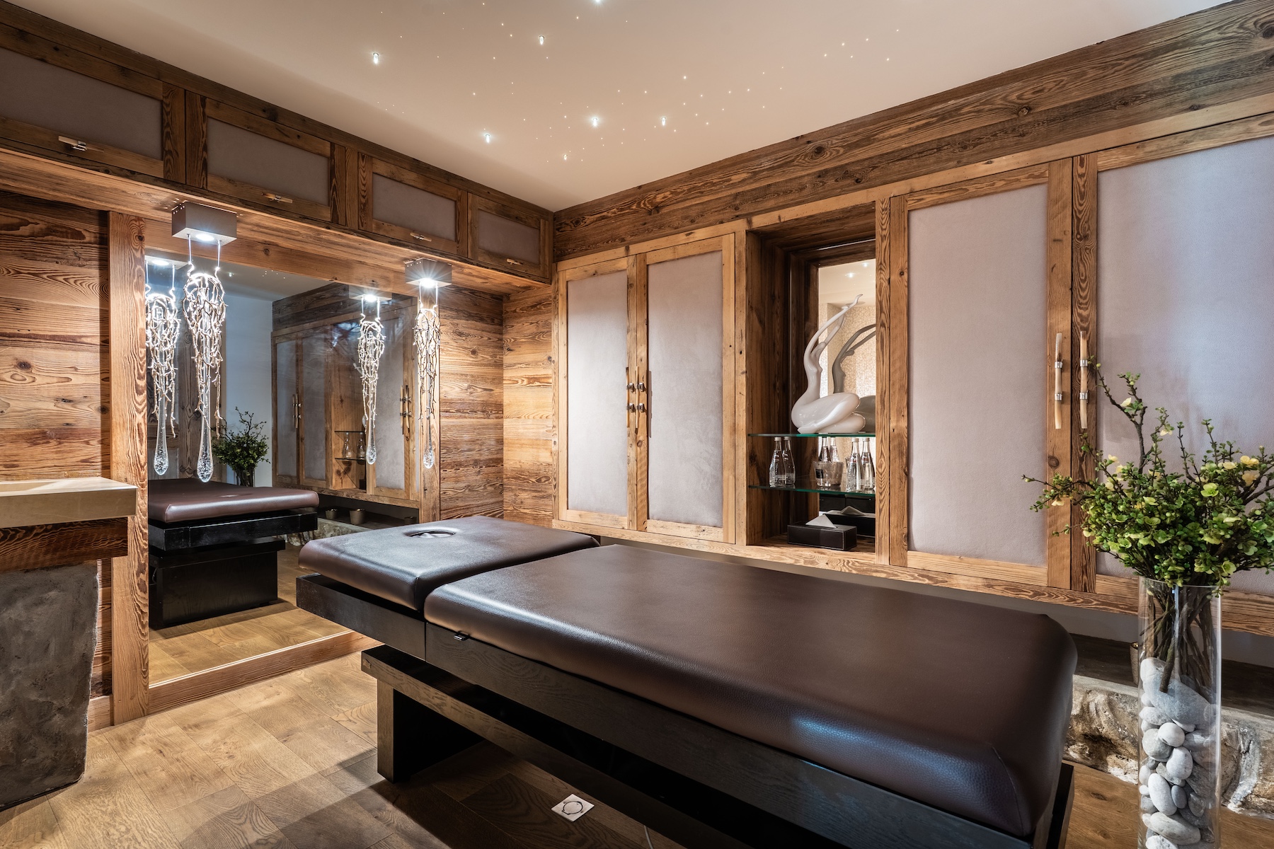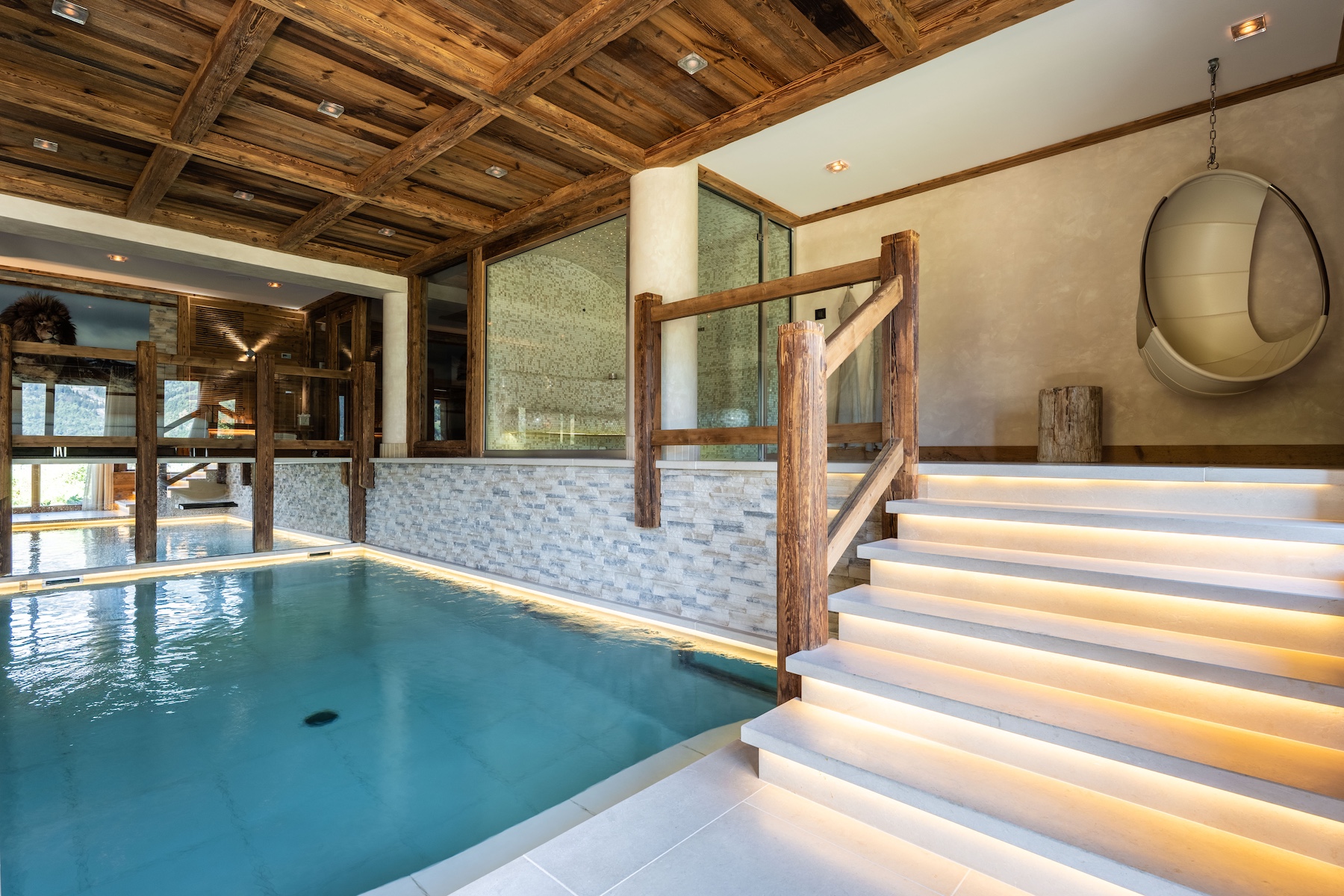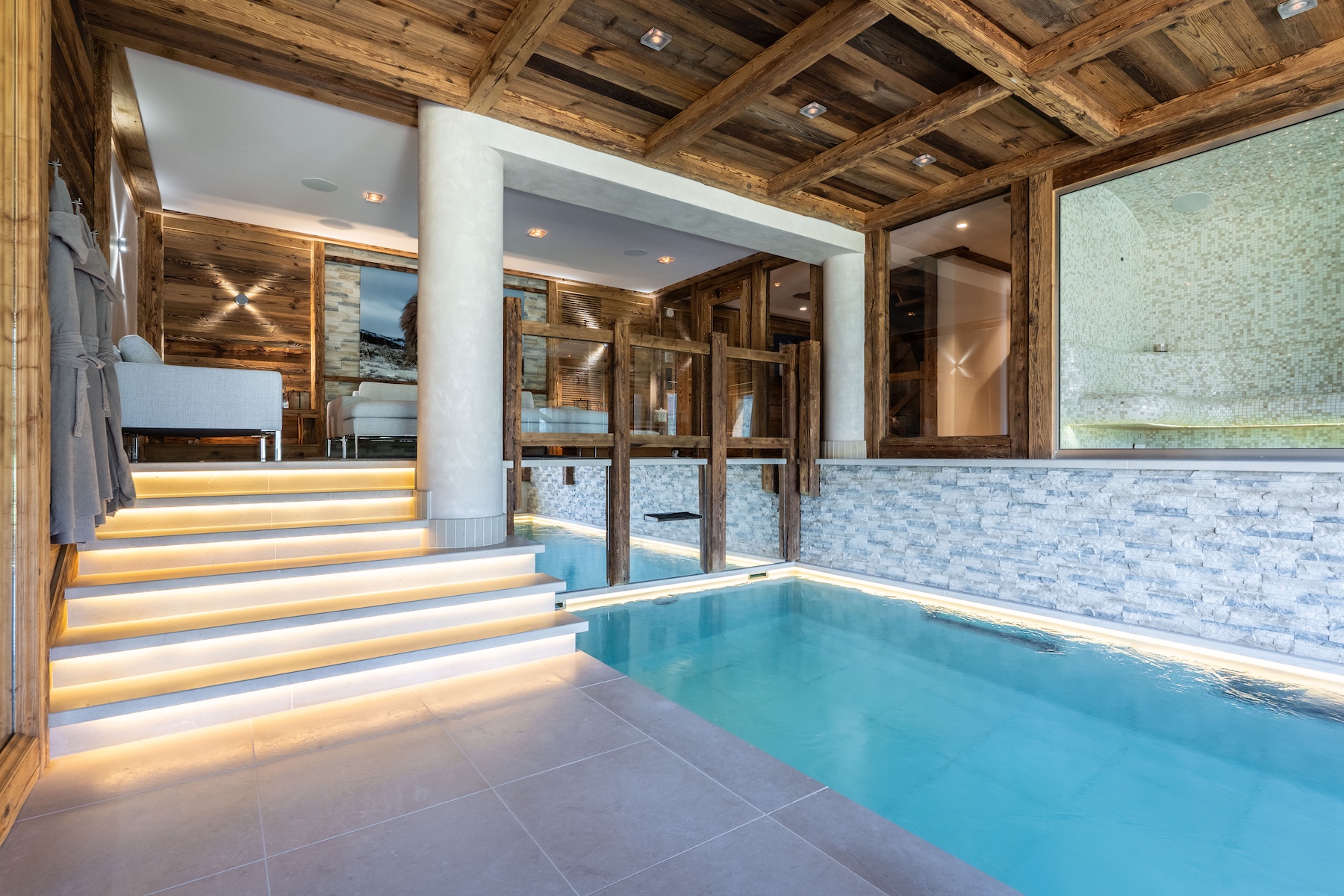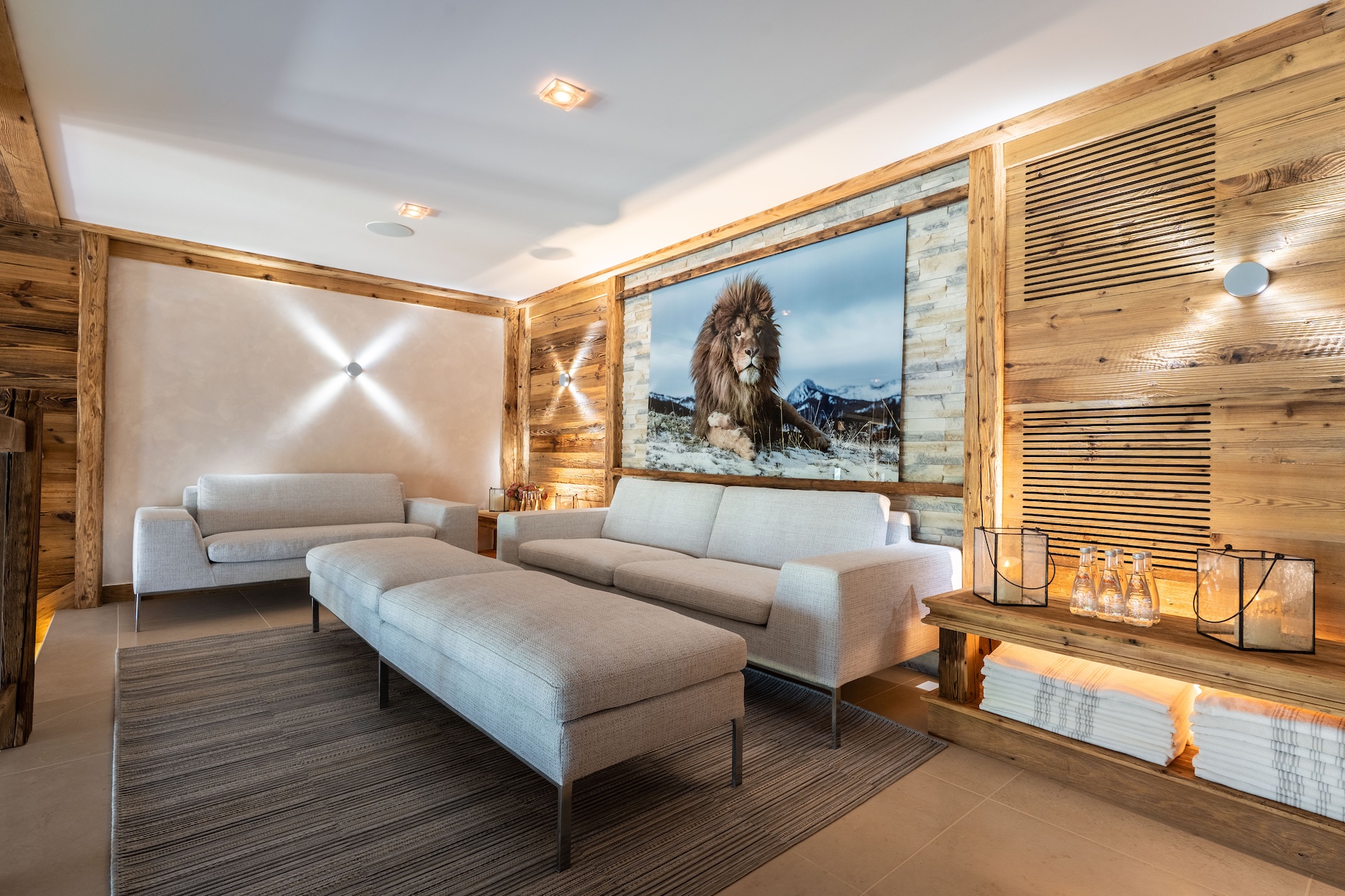 The valley level, with a surface area of 134 sq m, features a wellness area and a swimming pool with mountain views.