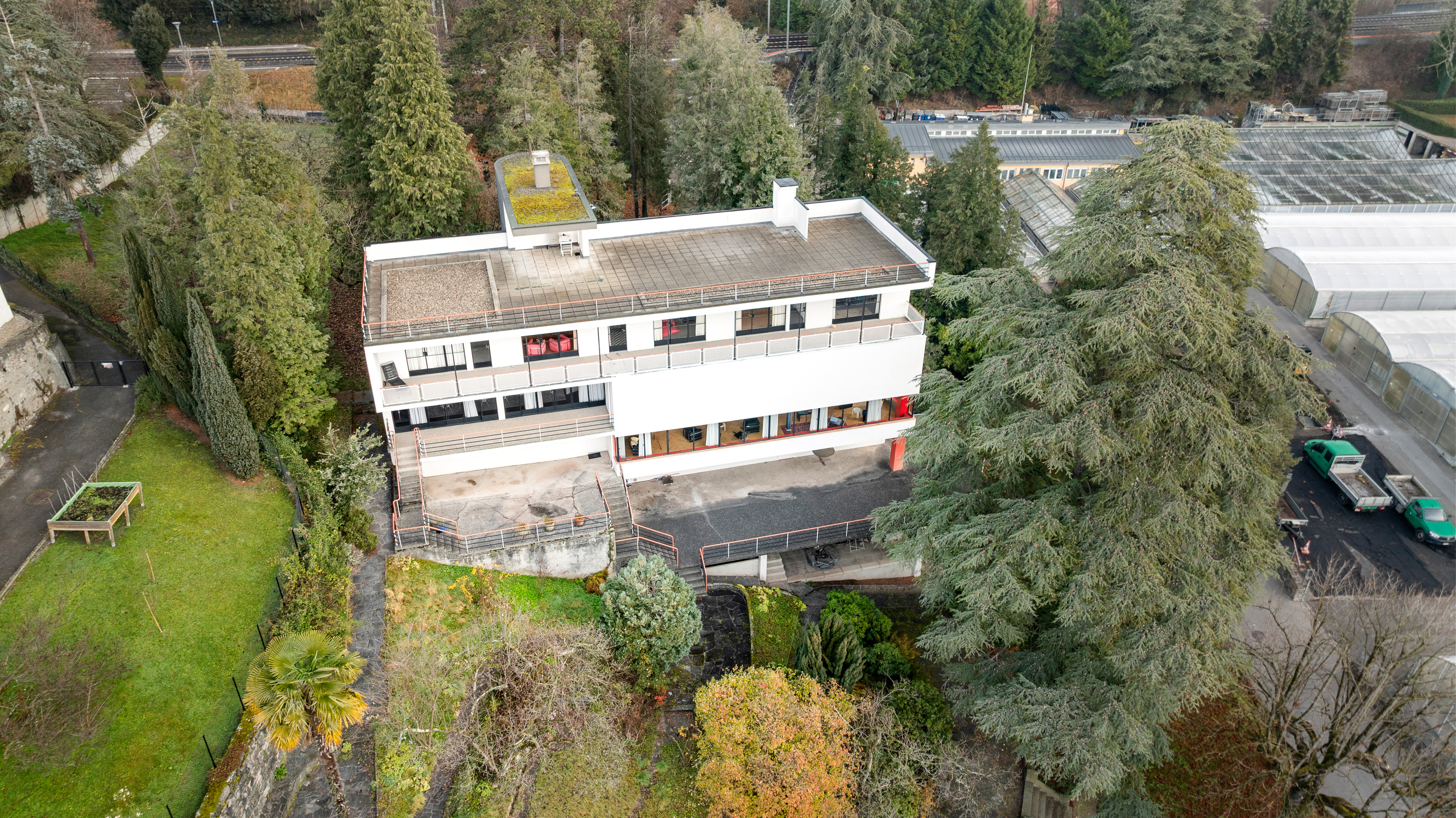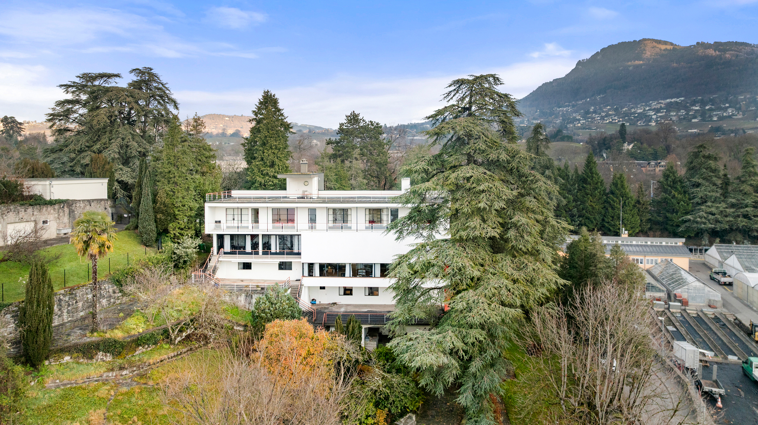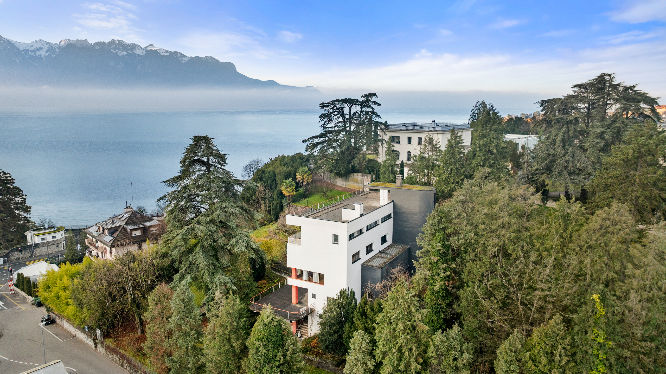 This splendid property on the Riviera was built in 1931 by Hungarian architect Alexander Ferenczy on behalf of English owners. It was then renovated by a Bauhaus art enthusiast in the 1980s and remains a unique property in this region. Nestled on a plot of just over 5,000 sqm with mature trees, facing the lake, the imposing building offers a floor area of around 750 sqm on four levels. Designed and furnished as a place to live, exhibit, entertain and work, in keeping with the Bauhaus concept, the villa features straight lines and large windows offering incredible light and a rather incredible lifestyle. The upper ground floor is almost entirely open plan with an impressive double-height ceiling. In contrast, the upper floor comprises six bedrooms and three bathrooms. The private roof terrace offers breathtaking views of the lake and the Alps. This