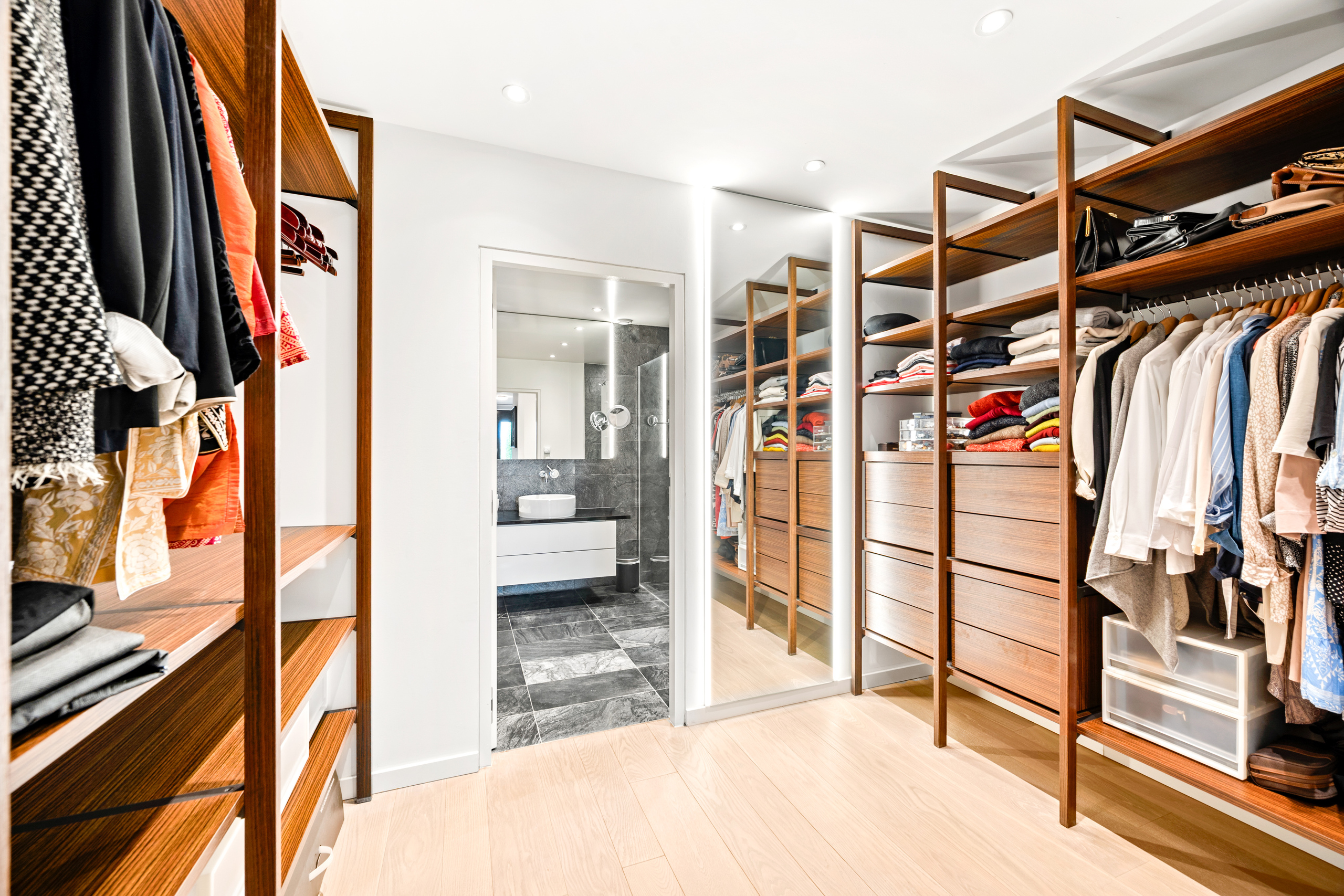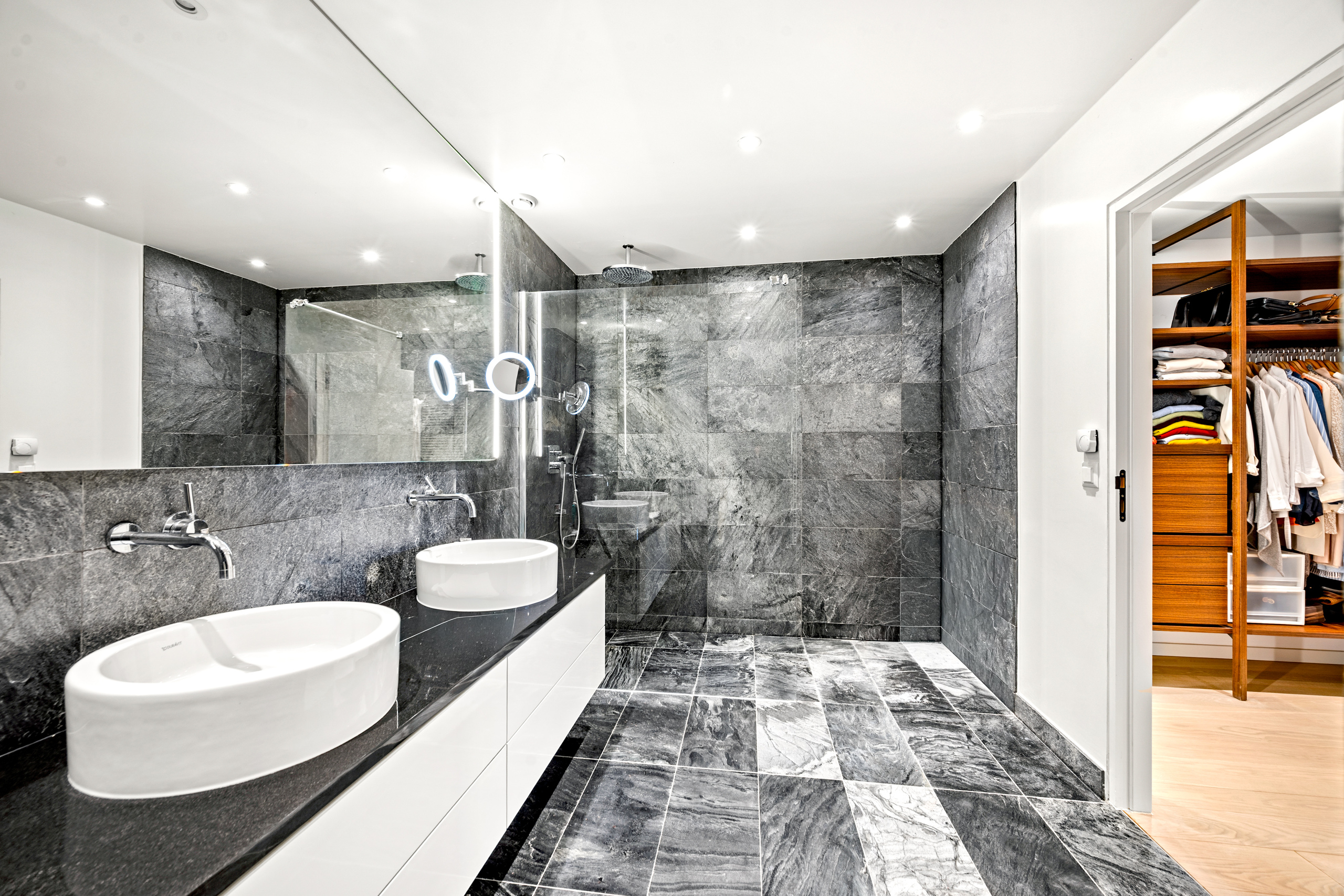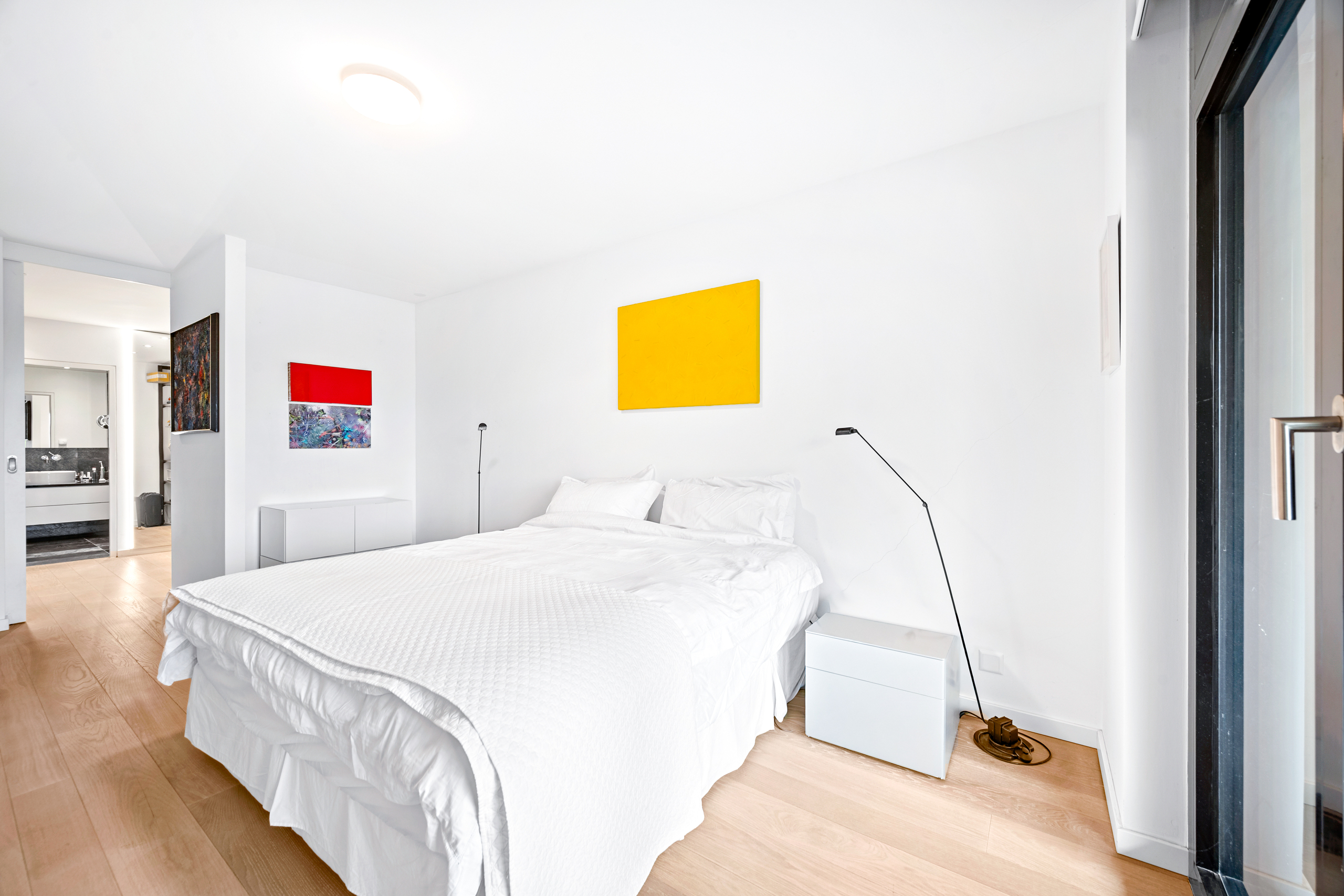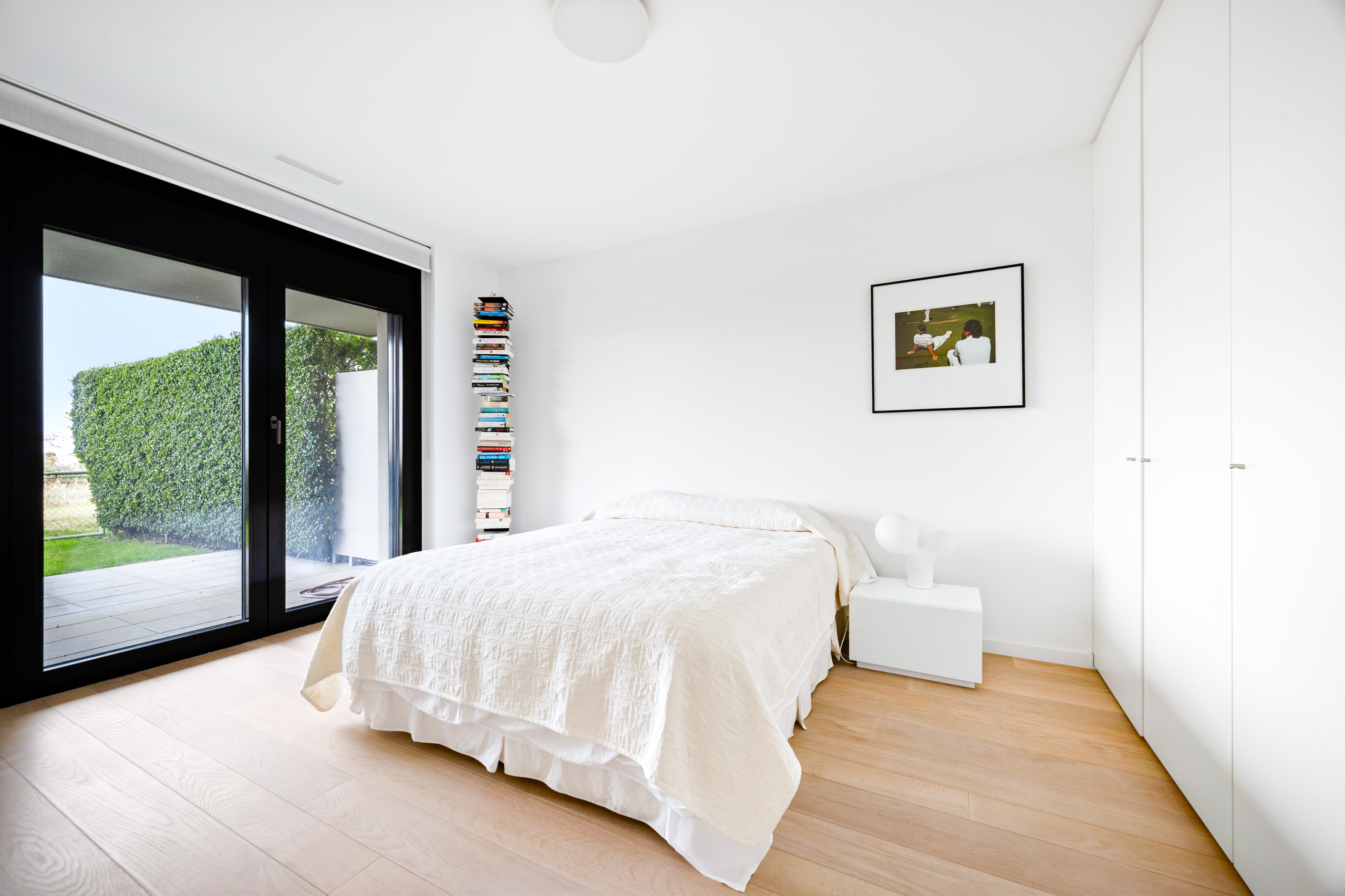 Le niveau inférieur, au rez-de-jardin, est consacré à l’espace nuit. Il comprend une suite parentale avec dressing et salle de douche attenante, ainsi que deux autres chambres à coucher disposant chacune de leur propre salle de bains. Toutes les chambres bénéficient d’un accès direct à une grande terrasse orientée à l’ouest ainsi qu’au second jardin, créant un espace extérieur agréable entouré de verdure.