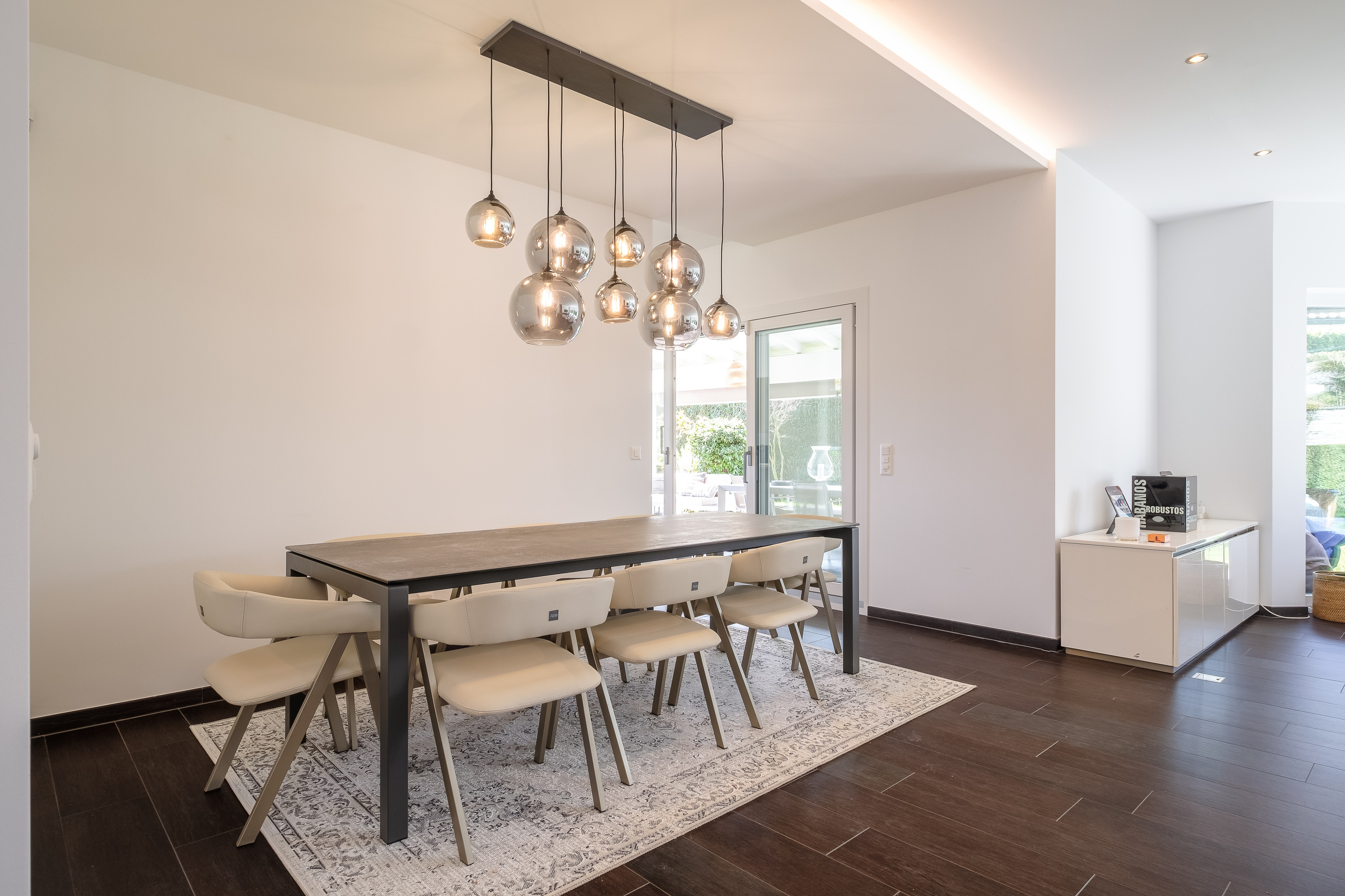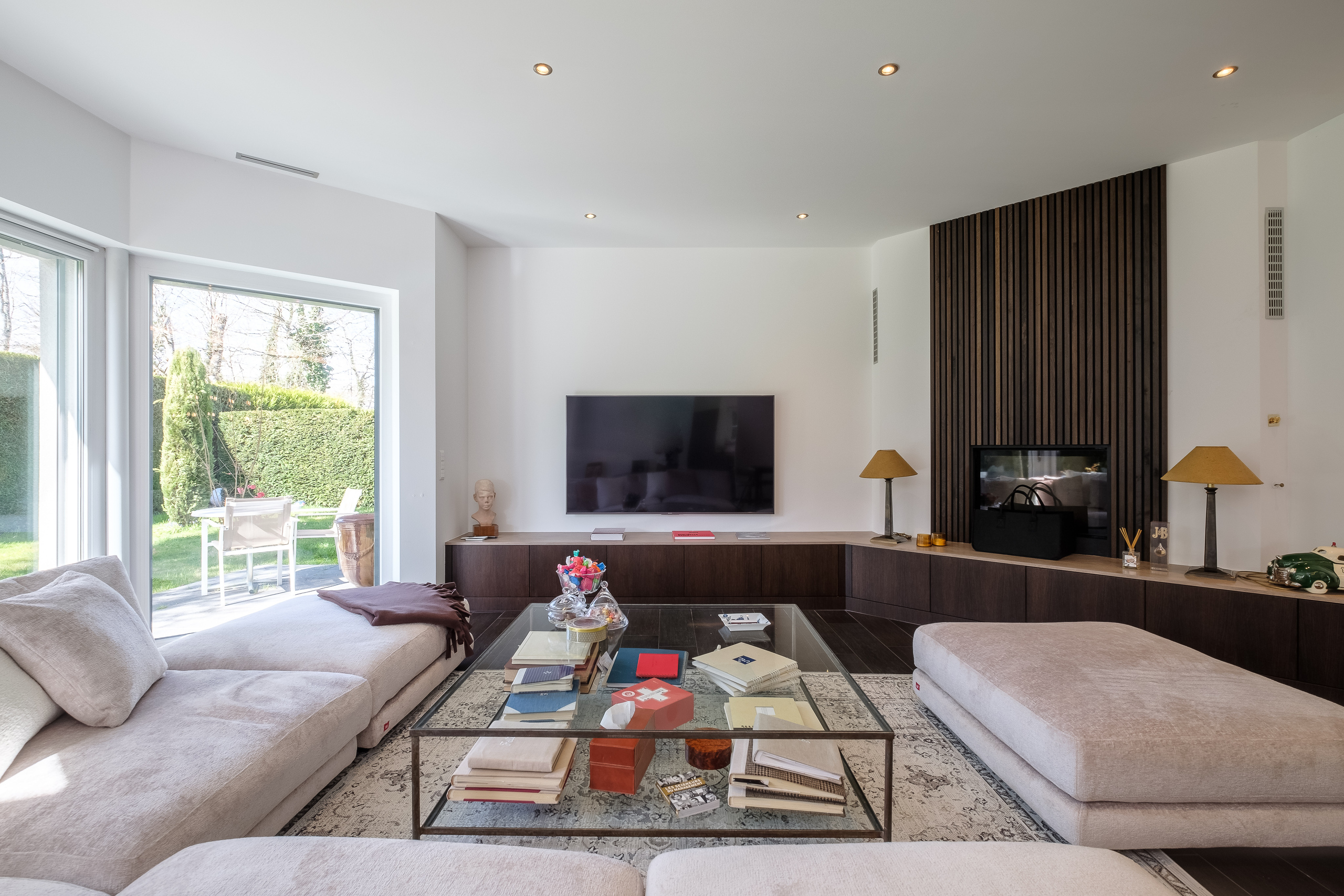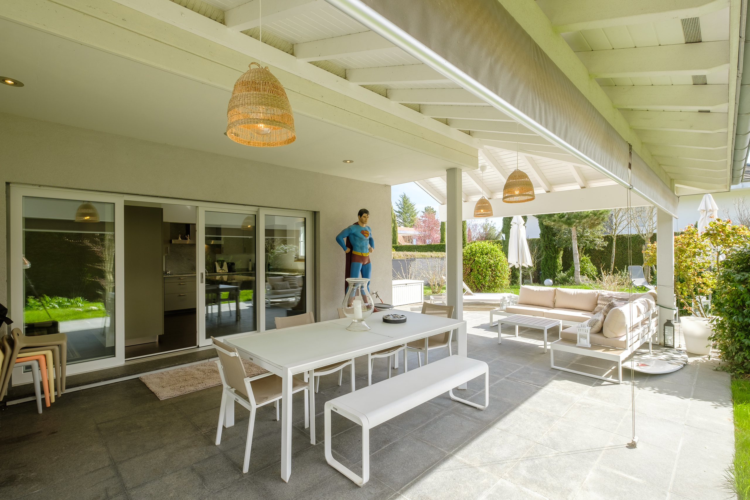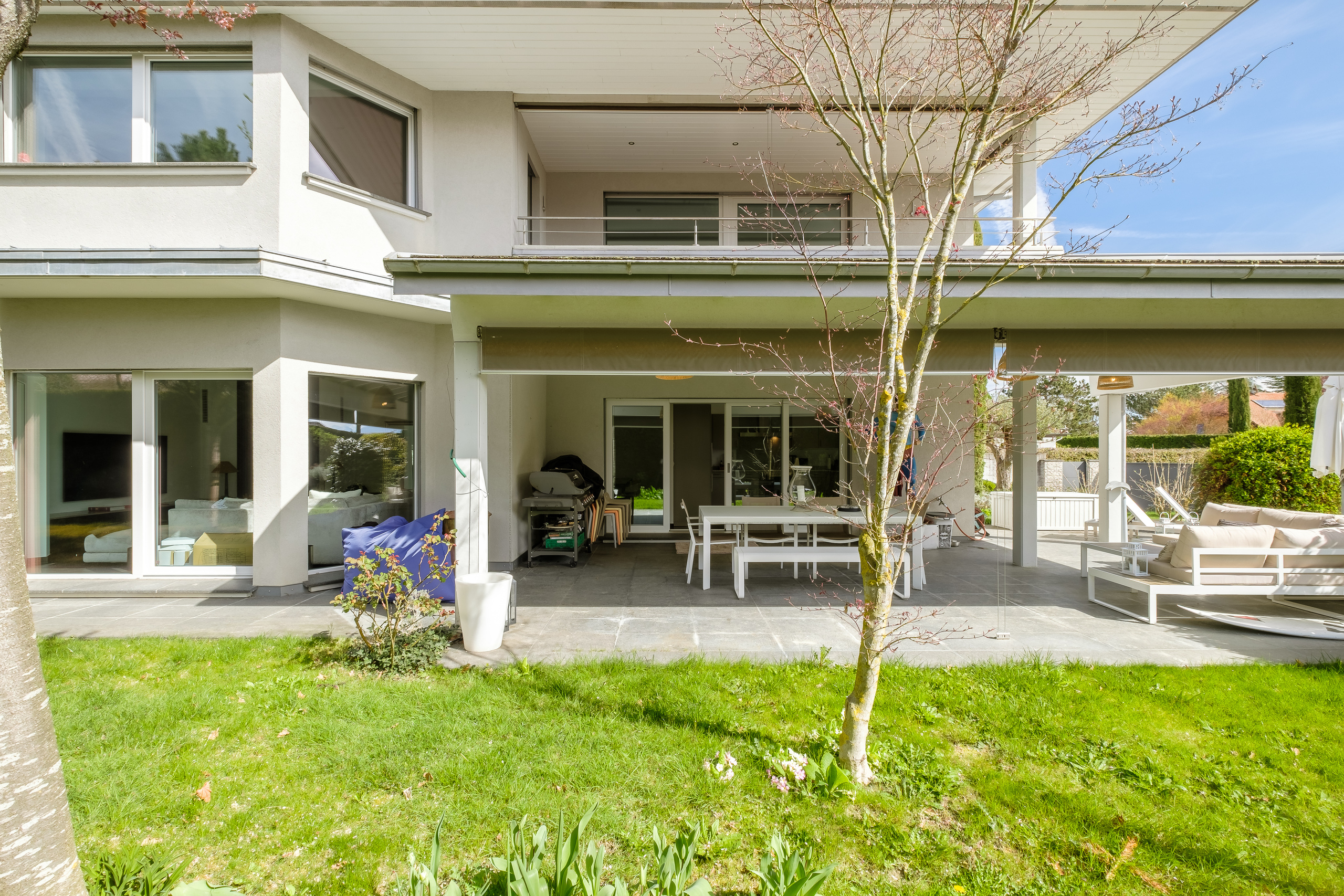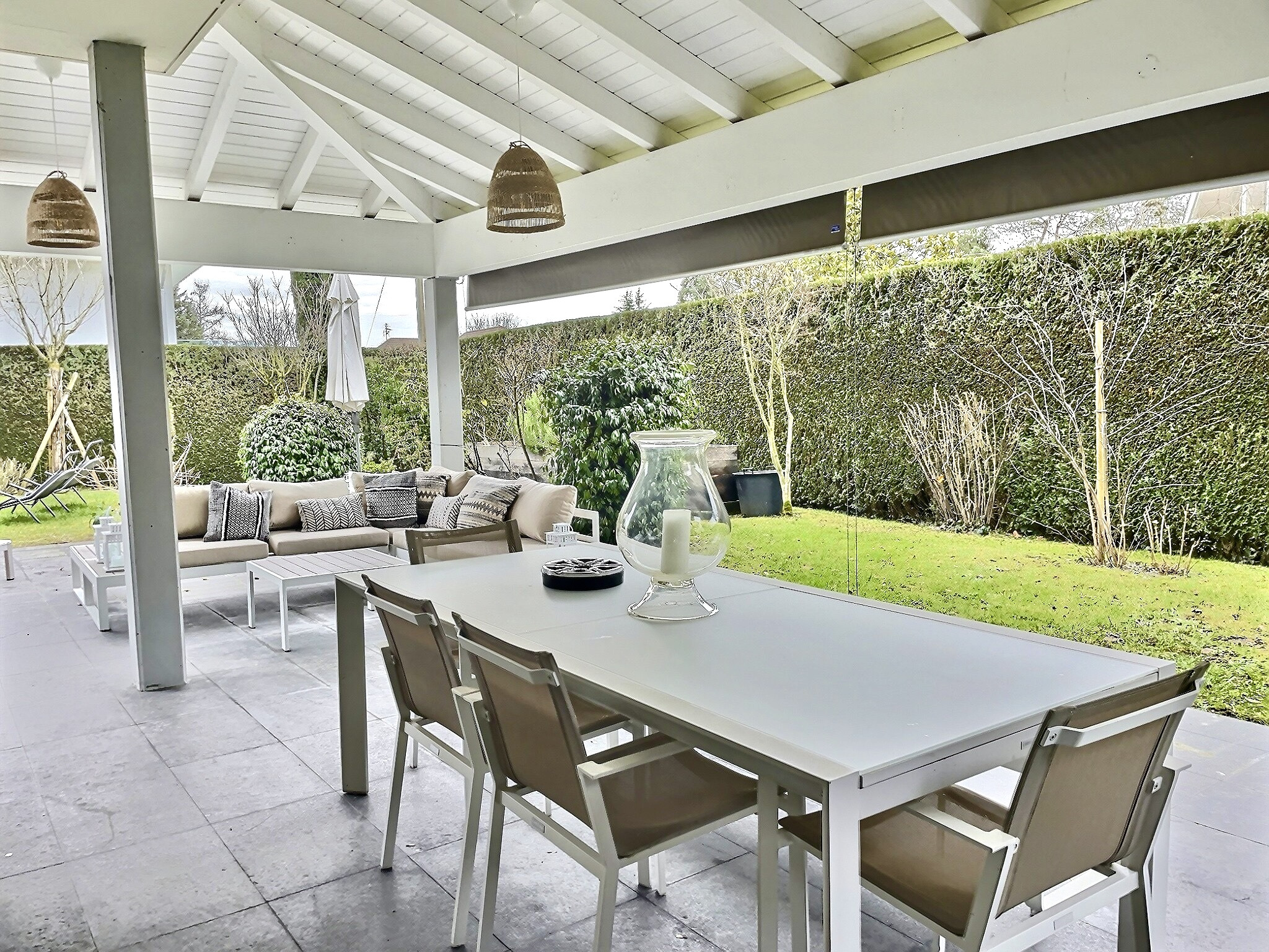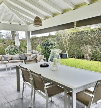 which bring in plenty of natural light. They all give direct access to the covered terrace and south-facing garden.