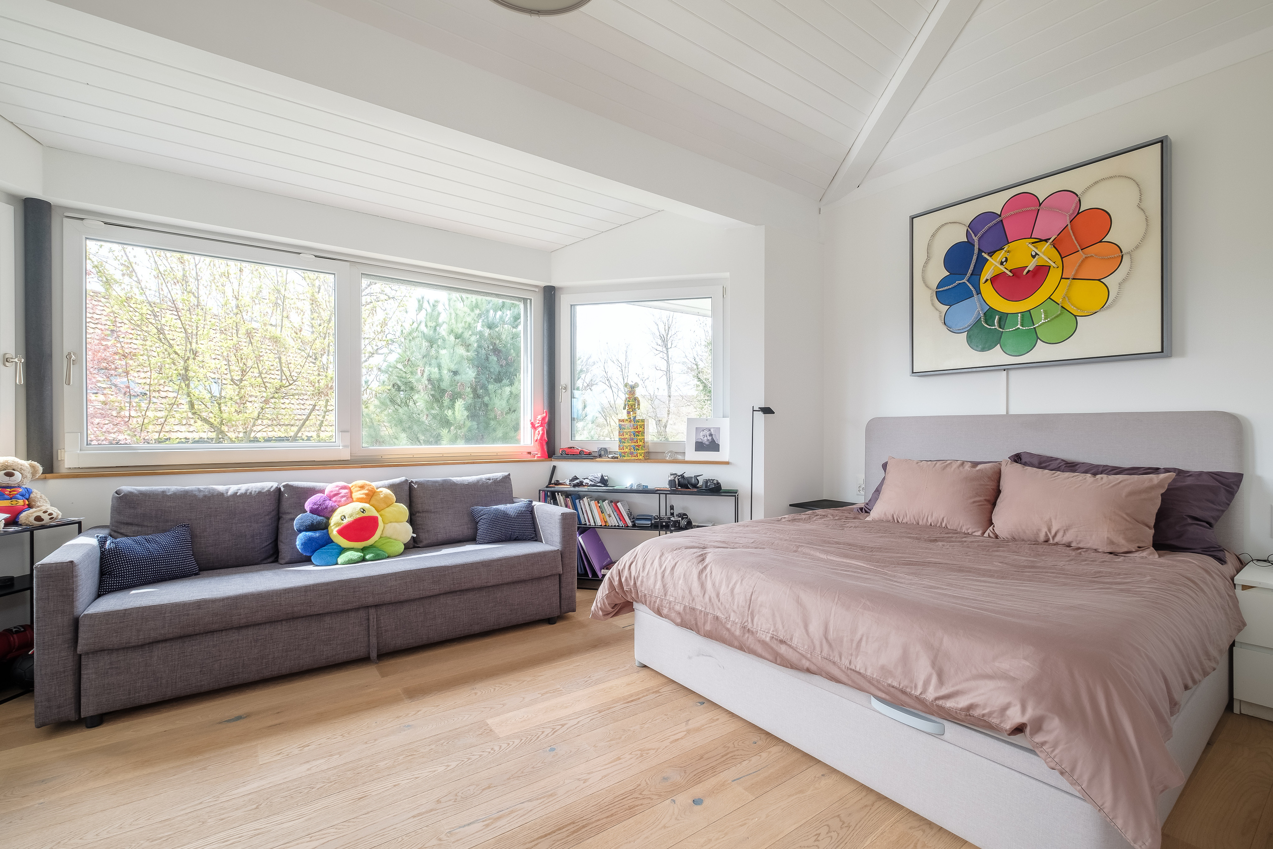 A large garage with car elevator for five cars and 2-3 outdoor parking spaces complete the property.