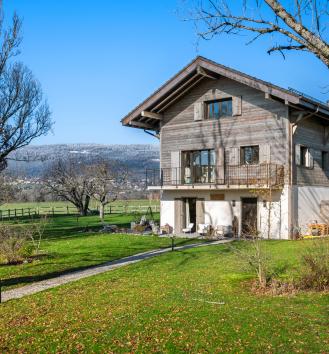 the property boasts a privileged exterior, including an east-facing terrace with unobstructed views of the Jura mountains and surrounding countryside, a petanque court and plenty of outdoor storage space.