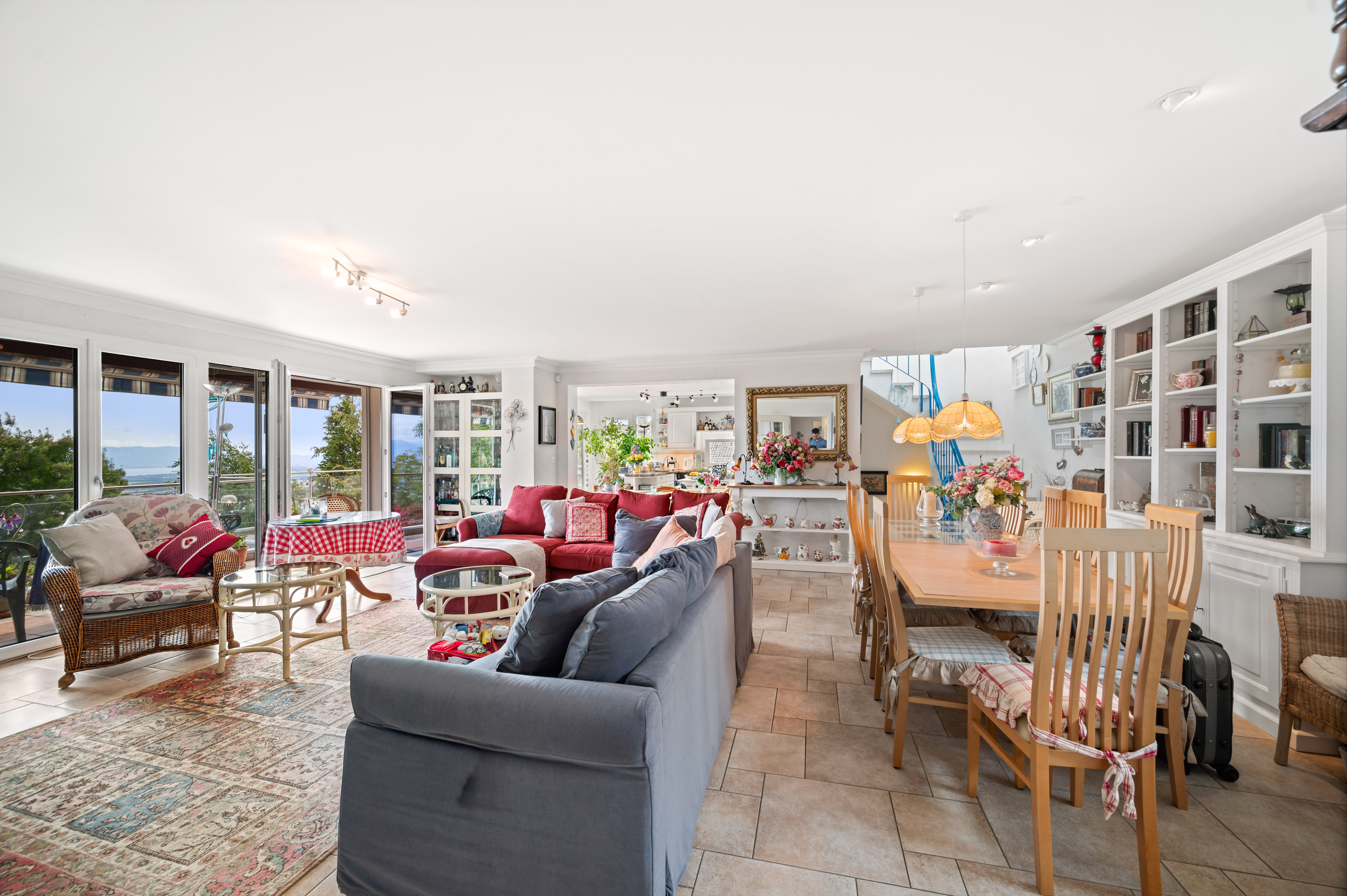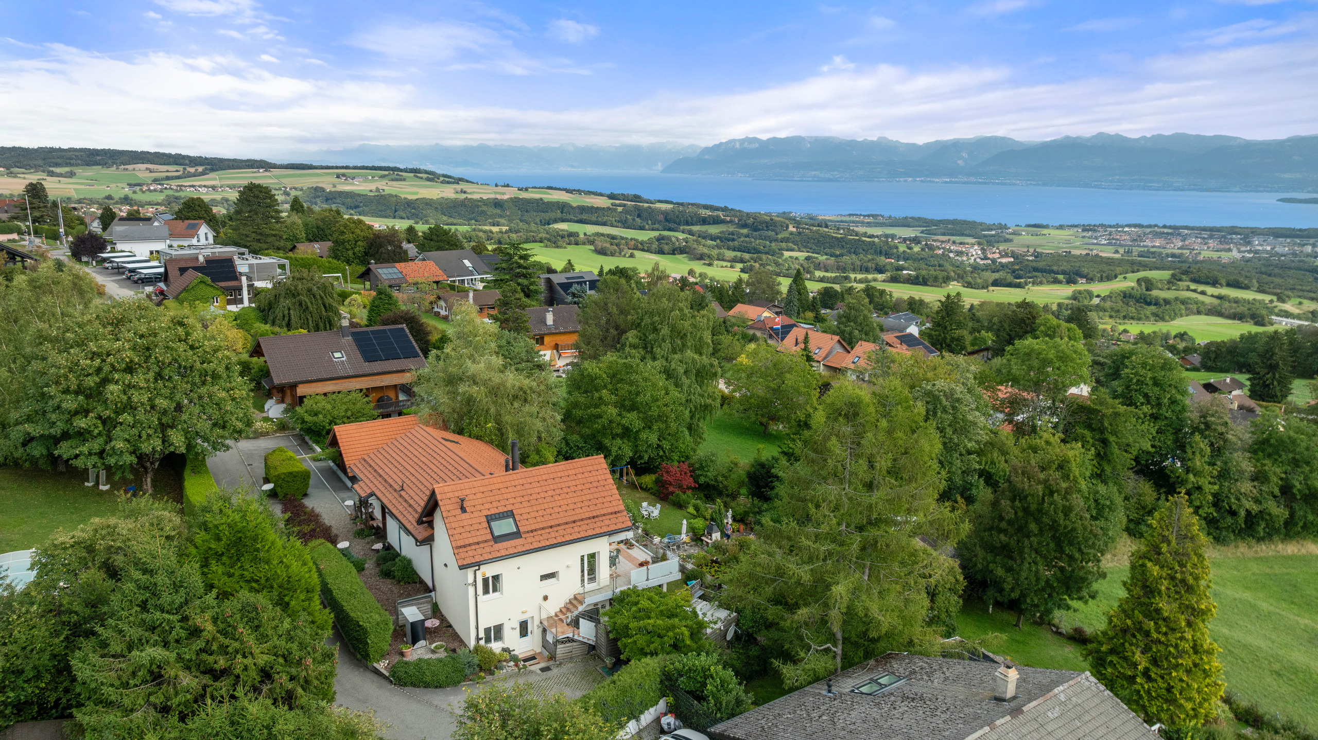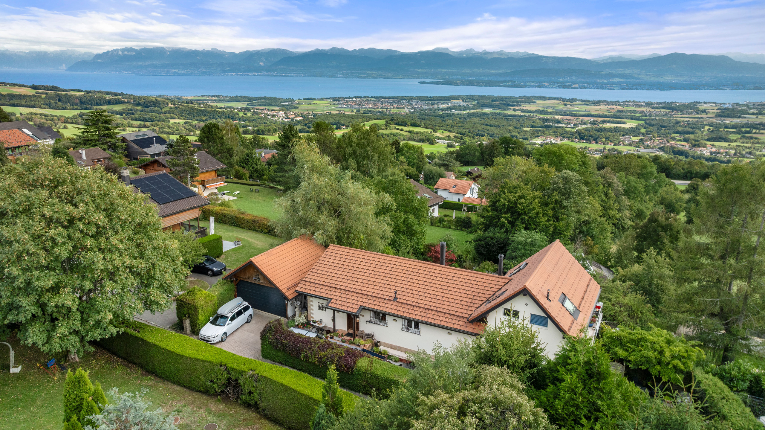 Situated in the sought-after heights of Arzier-Le Muids, this elegant 320 sqm detached house combines family comfort, generous living space and exceptional views. Surrounded by 1,169 sqm of landscaped grounds, it offers a rare quality of life between lake and mountains. As soon as you enter, you will be seduced by the spacious, light-filled, south-east-facing living area, comprising a lounge with fireplace, a convivial dining room and a fully fitted and equipped open-plan kitchen with pantry. The whole opens onto a panoramic terrace with uninterrupted views of Lake Geneva and Mont Blanc. Two beautiful bedrooms, a study area and a bathroom complete this level. Upstairs, a superb master suite with bathroom, balcony and attic storage offers a warm, intimate atmosphere. The lower ground floor features a basement with a separate living area ideal for family, guests or staff, including a lounge, open-plan kitchen, three bedrooms and three