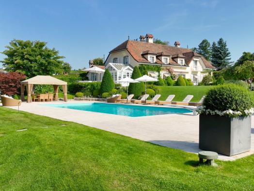 Magnificent Family Estate in a Pristine Setting Near Lausanne Set on over 11,000 sqm of beautifully preserved land, this exceptional estate offers absolute tranquility while remaining close to Lausanne. The property comprises two residences and a separate building designed exclusively for hosting receptions, capable of accommodating up to 150 guests. In total, the estate features around twenty rooms spread across the three buildings. It boasts a stunning outdoor swimming pool (13x5m) with a pool house, numerous terraces with panoramic views of Lake Geneva, a large indoor spa area, a wine cellar, and multiple garages—including boat parking. The property's development potential allows for the construction of additional buildings, such as stables or a tennis court. The Main Villa This elegant residence in the traditional Vaud style was originally built in 1967 and expanded in 1992. It offers approximately 400 sqm of living space, complemented by an additional 150 sqm dedicated to a spa and wellness area. The ground floor features a spacious reception area. From the entrance, you are welcomed into a double living room that opens onto a bright veranda, adjacent to the kitchen and often used as a dining room. Large French doors provide direct access to the south-facing terraces, which overlook the surrounding countryside and offer spectacular views of Lake Geneva. This level also includes a bedroom with an en-suite bathroom. Upstairs, the house is divided into two wings. One side hosts the master suite, while the other includes two additional bedrooms, two bathrooms, and an office. The basement, expanded during the 1992 renovation, houses an extensive wellness area equipped with a spa, hammam, and sauna. It also includes a beautiful wine cellar, a fully equipped carnotzet (traditional Swiss tasting