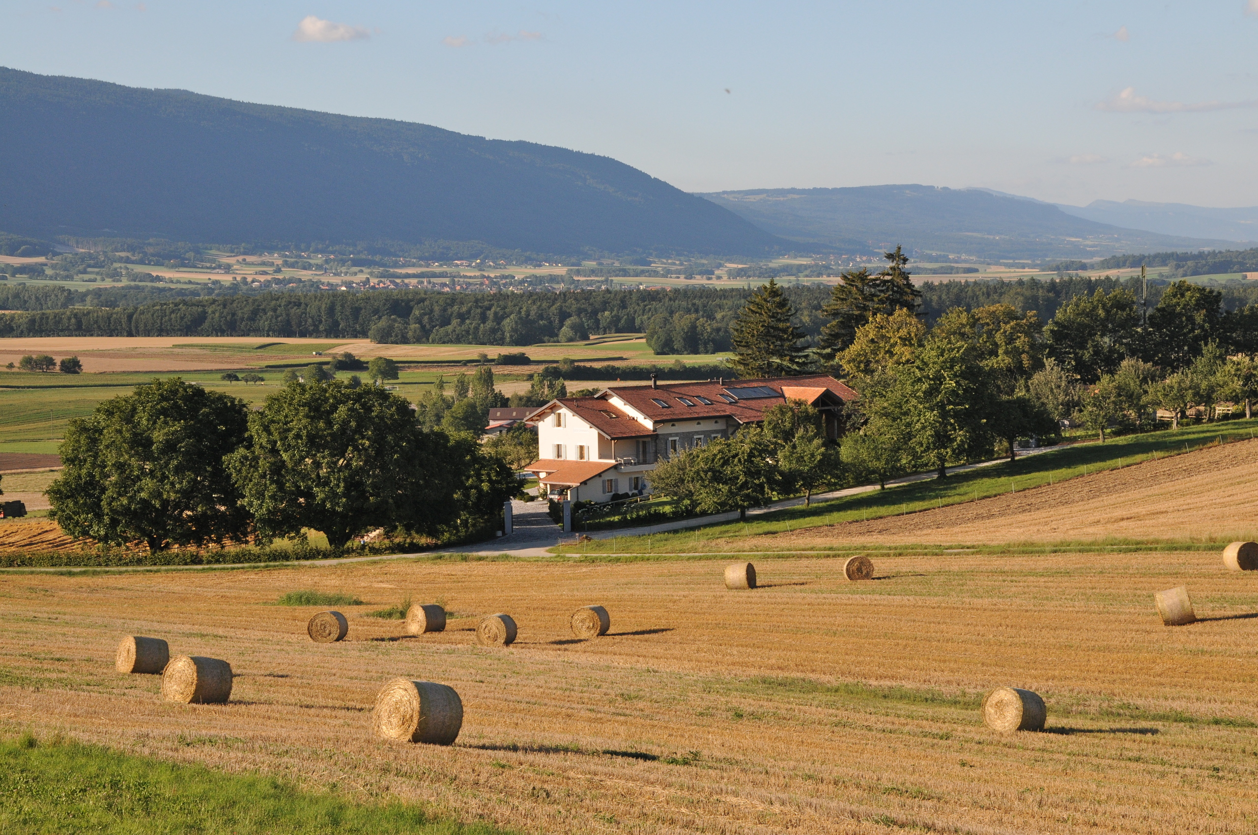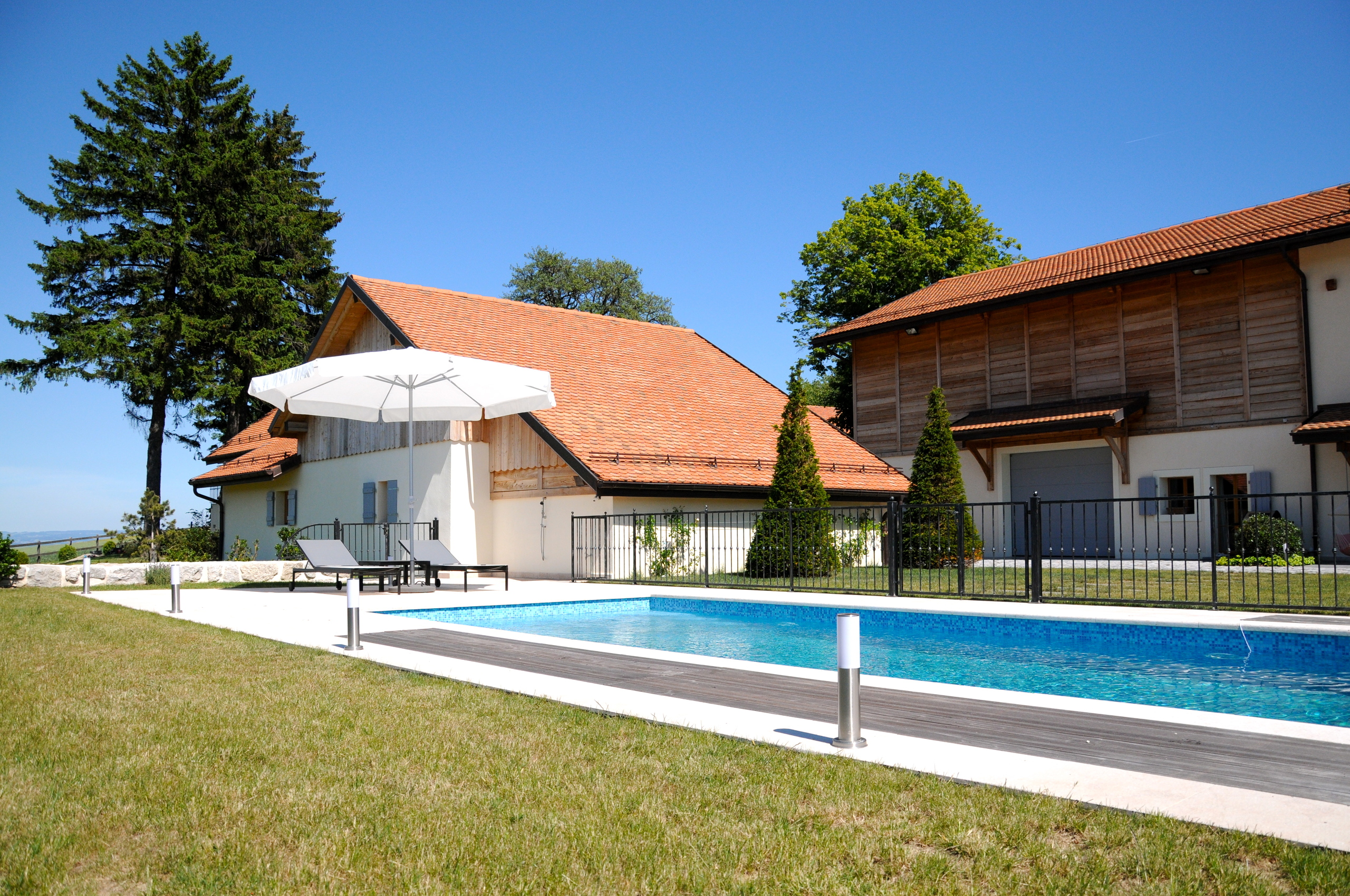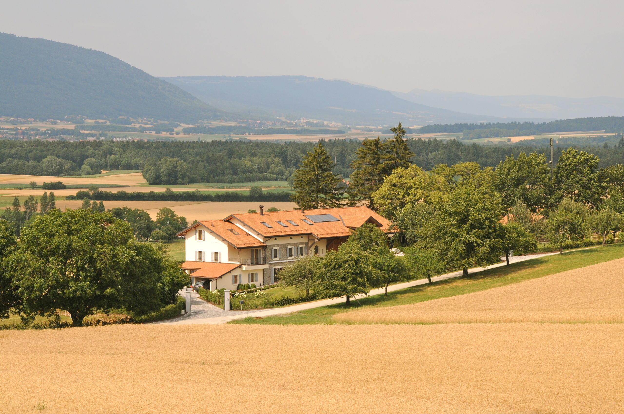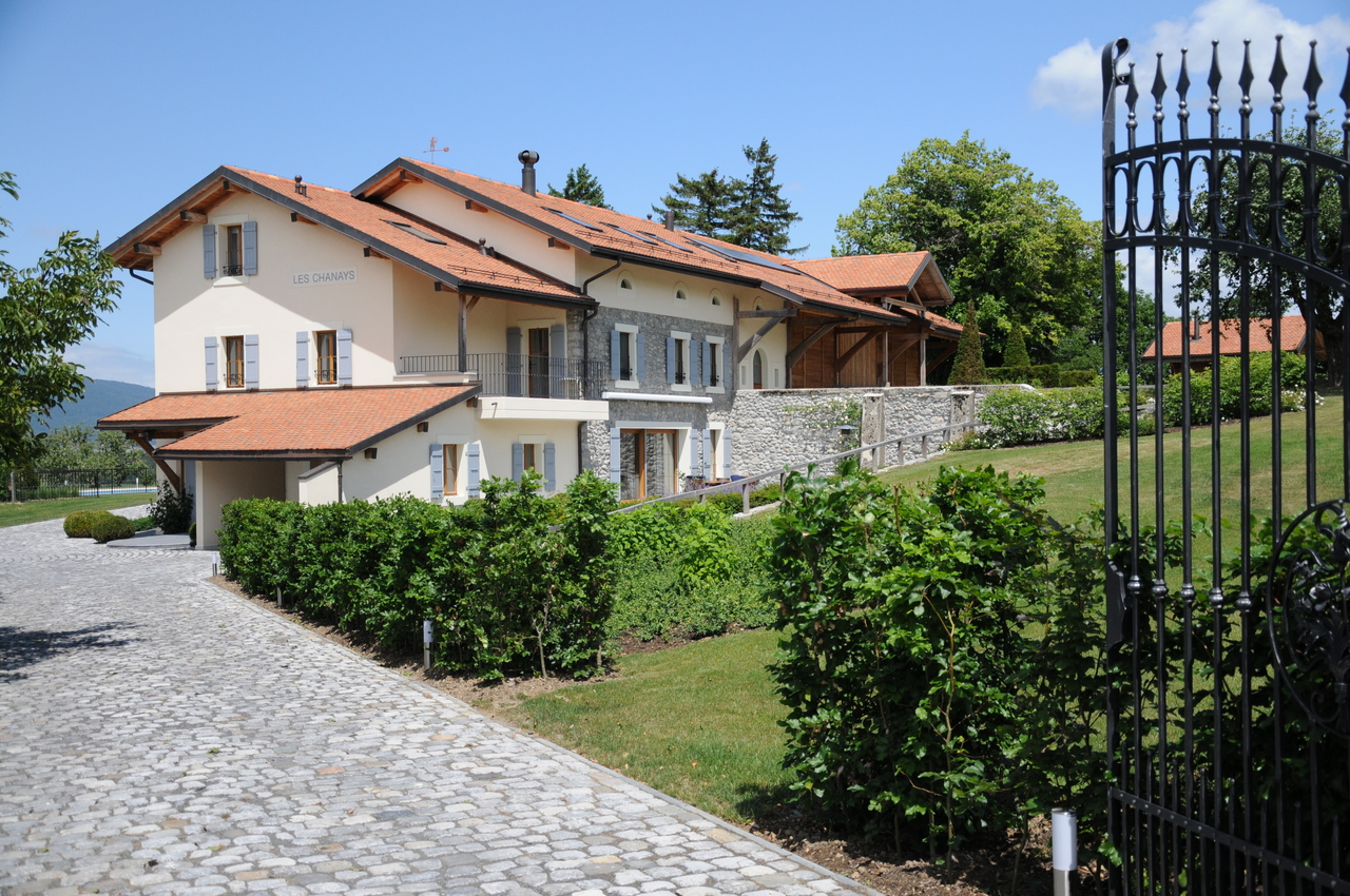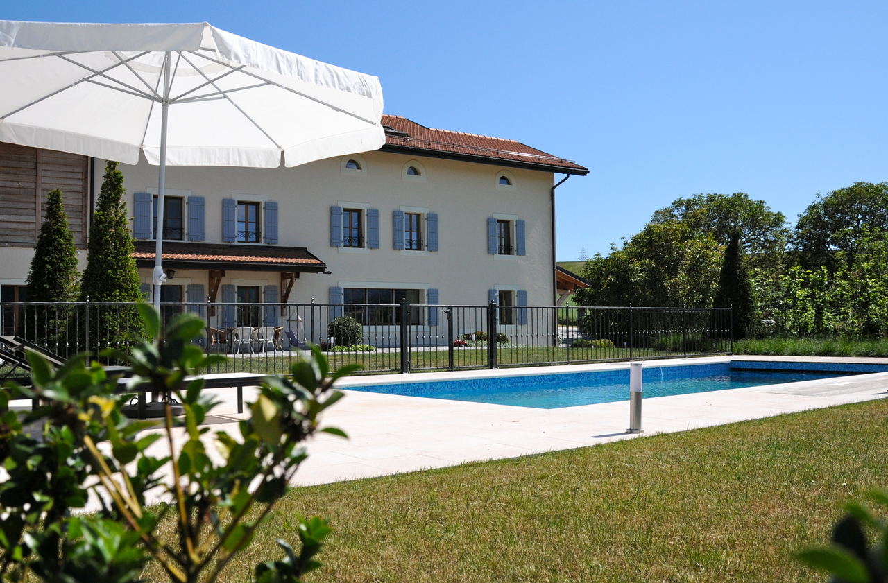 Cette superbe ferme du 19ᵉ siècle, entièrement rénovée en 2009, allie avec harmonie le confort moderne, le charme authentique et des touches contemporaines. Luxe, raffinement et sérénité s’y rencontrent naturellement, offrant un véritable voyage au cœur d’une campagne préservée et d’un parc exceptionnel de plus de 11'000m2. Havre de paix, la propriété profite d’une situation idéale : à seulement 25 minutes de Genève et 20 minutes de Lausanne, tout en étant proche des écoles, des commerces et des principaux axes de communication. Équipée de prestations modernes et d’une architecture intérieure soignée, elle séduit également par son histoire et son élégance intemporelle. En complément de la maison principale, la propriété propose deux chalets d’invités, un appartement indépendant, plusieurs annexes polyvalentes ainsi qu’une vaste grange offrant de multiples possibilités d’aménagement. La maison principale s’ouvre sur une belle entrée avec dressing et WC visiteurs, une salle à manger et un salon avec cheminée, sublimés par de magnifiques parquets en chêne blanchi. Une grande terrasse en pierres naturelles avec son étang prolonge harmonieusement ces espaces de vie. Une cuisine équipée et une buanderie complètent ce niveau. À l’étage, une superbe suite parentale comprenant bureau, dressing, salle de bains et terrasse privée est accompagnée
