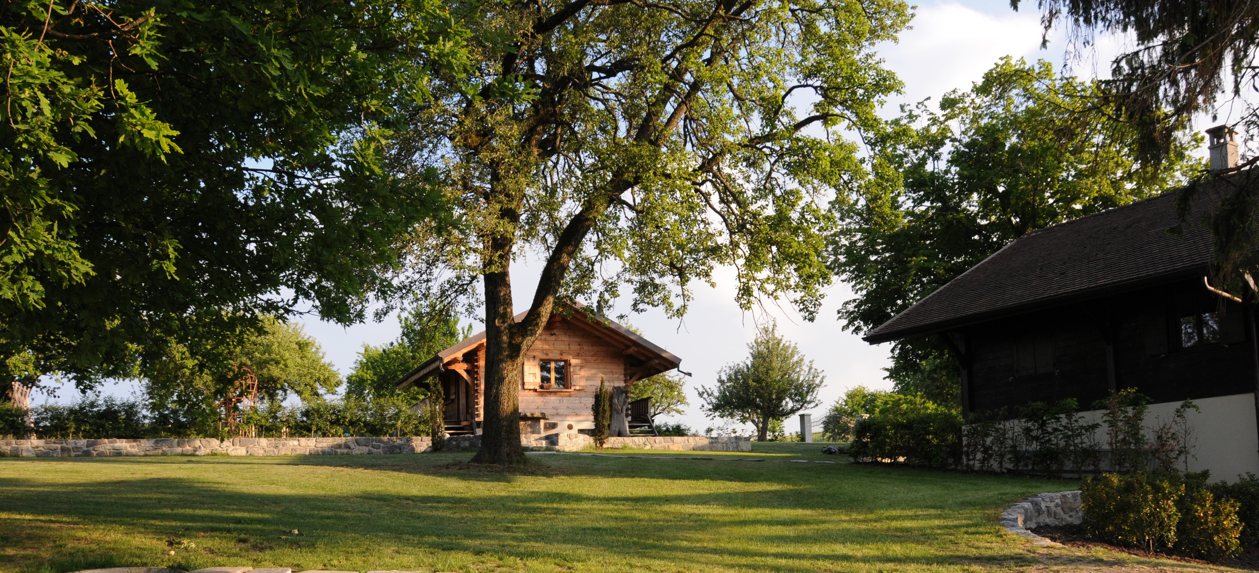 Deux chalets en mélèze, nichés au cœur du parc, disposent chacun d’une pièce de vie, d’une cuisine, d’une chambre, d’une salle de bains et d’un balcon, idéals pour héberger famille et invités.
