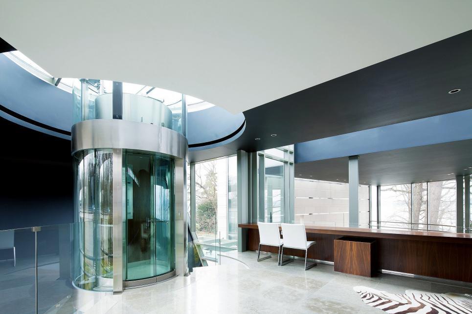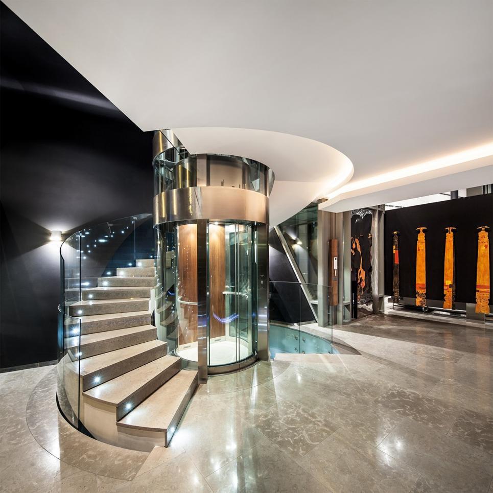 Tous les étages sont reliés par un superbe escalier au design épuré, ainsi que par un ascenseur en verre.