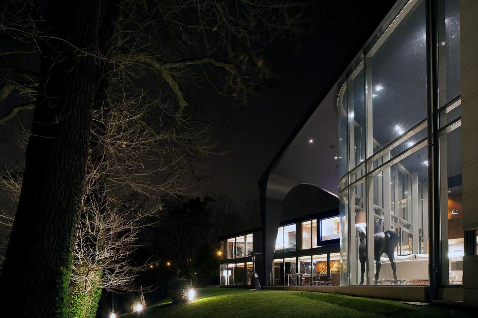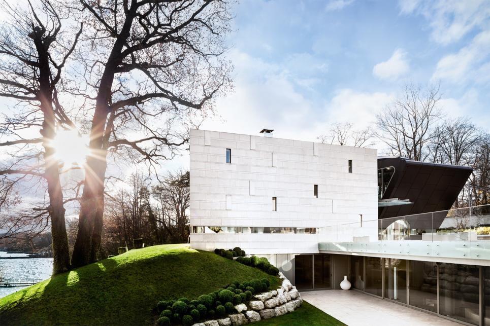 Jouissant d’un emplacement exceptionnel sur les rives du lac Léman, proche des organisations internationales et de l’aéroport, cette propriété aux lignes sculpturales et puissantes dispose d’une surface de 1’772m2 répartie dans un bâtiment principal, d' une annexe et d'un modeste bâtiment classé. Ce remarquable ensemble aux bords arrondis et aux lignes triangulaires arbore une architecture imposante et contemporaine qui mise sur la transparence pour dévoiler l’extraordinaire vue sur le Mont Blanc et le lac. Dans l’édifice principal le vaste hall d’entrée distribue les spectaculaires pièces de réception. Celles-ci sont composées d’un salon aux impressionnantes hauteurs sous plafond, d’une salle à manger, d’une superbe cuisine équipée et d’un second salon familial, le tout prolongé par une grande terrasse qui domine le lac. Le premier étage accueille l’espace nuit. Il se compose de la splendide suite parentale avec son généreux dressing et sa salle de bain attenante,