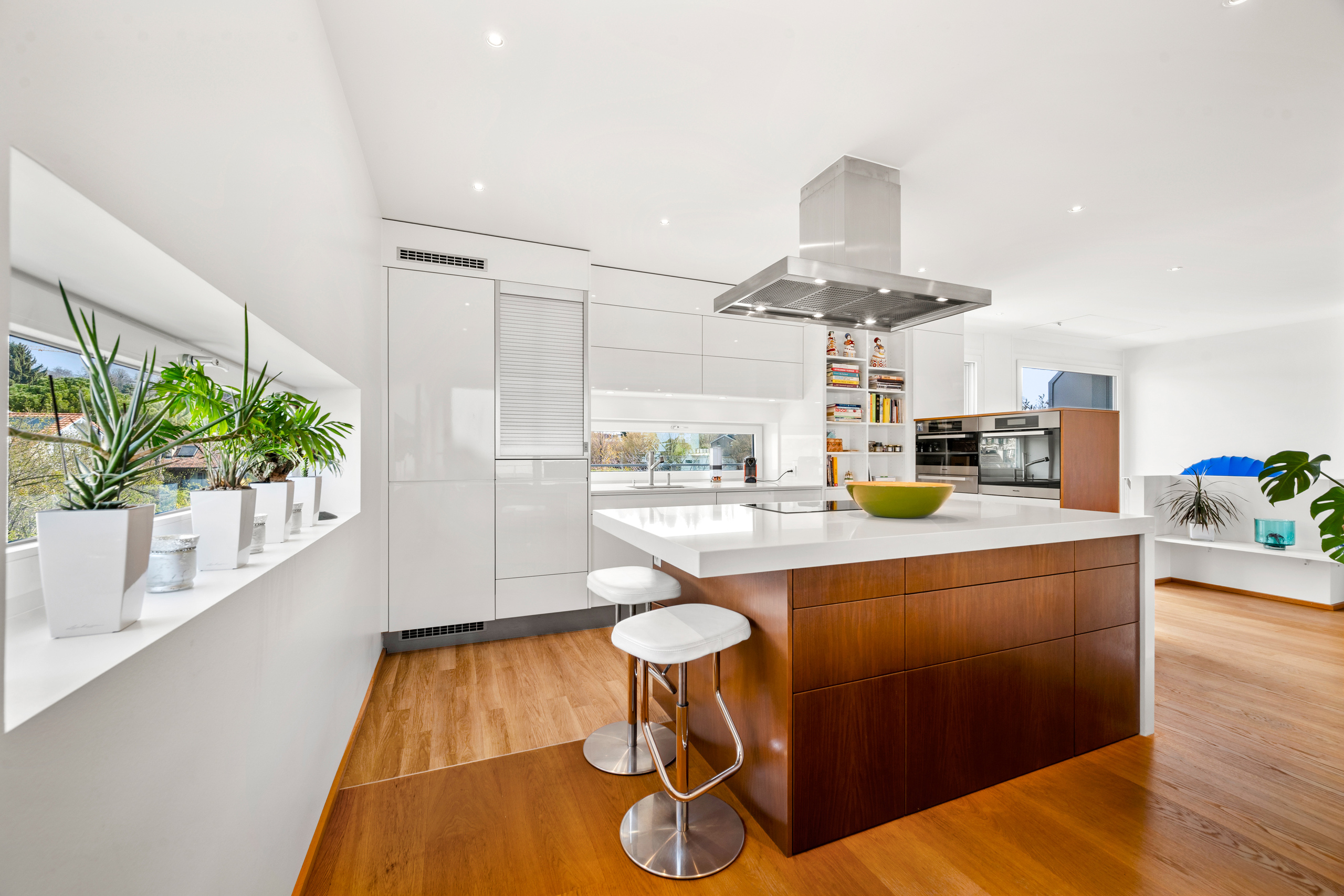 inférieur accueille trois chambres avec balcons et placards intégrés, deux salles de bains avec douche, dont une équipée d’une colonne de lavage, ainsi qu’une suite parentale comprenant un bureau, un dressing, une salle de bains avec douche et baignoire, et un accès direct au balcon. Le rez supérieur est dédié aux espaces de vie et propose un vaste séjour traversant avec poêle, une cuisine entièrement équipée, une salle à manger, ainsi qu’un accès direct à une magnifique terrasse offrant une vue imprenable sur le lac. Enfin, ce bien est complété par un grand local de 52 m² comprenant plusieurs espaces de rangement et un WC, ainsi que deux places de parc intérieures, en sus du prix de vente à CHF 80’000.–.