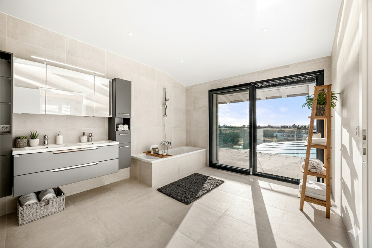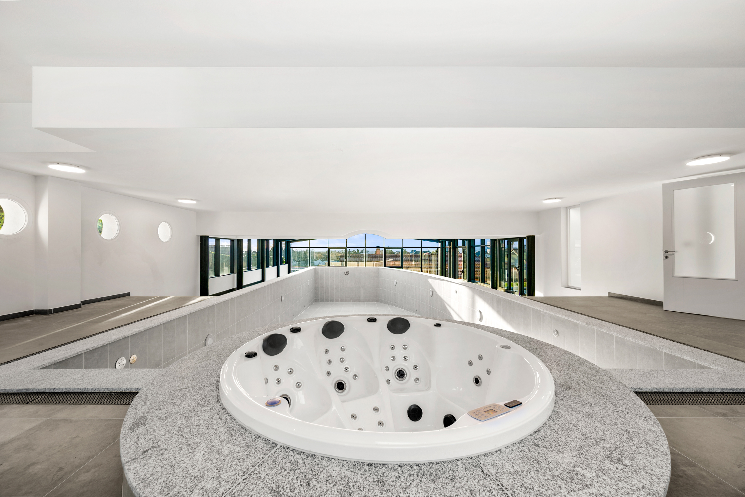 accessible depuis la piscine et le jacuzzi, une partie du niveau inférieur est dédiée au bien-être, comprenant deux douches, un sauna et un hammam, formant un véritable spa privé. Ce même niveau propose également de vastes espaces polyvalents, parfaits pour un home cinéma, une salle de sport ou un espace de loisirs, ainsi qu’une buanderie et des locaux techniques.